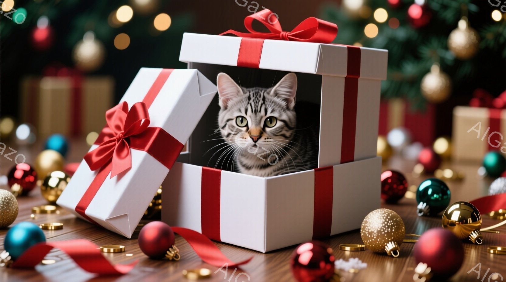 白いギフトボックスの中に、縞模様の可愛らしい子猫が顔を出している。赤いリボンがボックスに結ばれ、周りには赤や金、緑のクリスマスオーナメントが散らばっており、木製の床が暖かく照らされている。この光景は、クリスマスの喜びと可愛らしさを表現しており、温かく幸せな雰囲気を醸し出している。