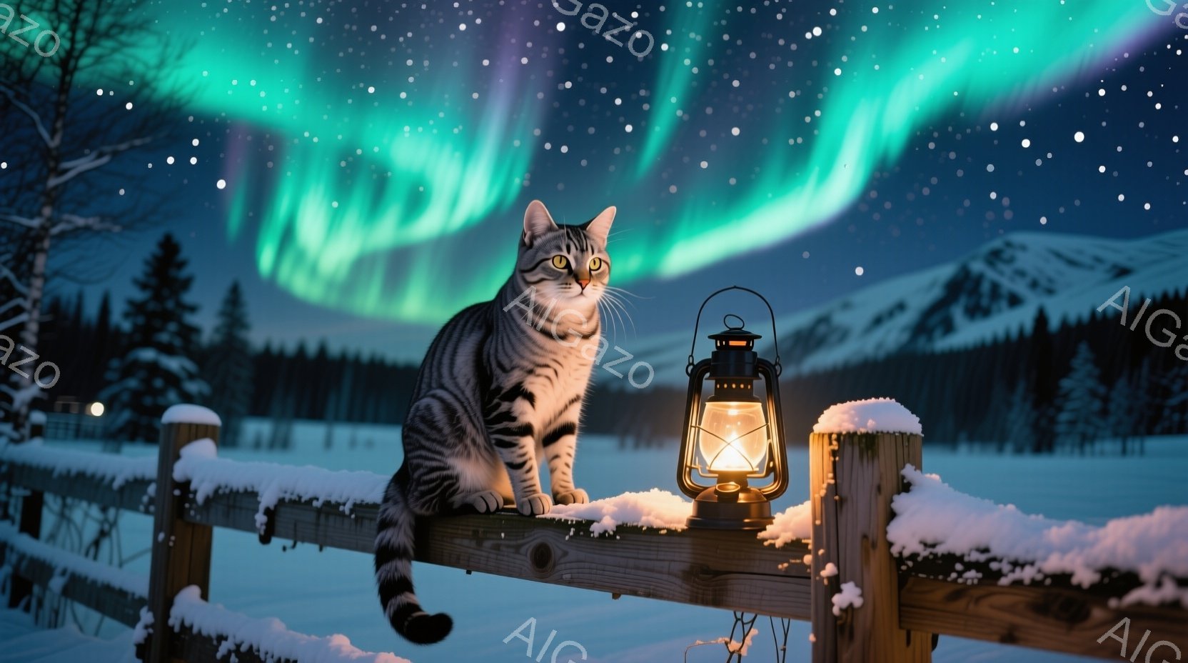 縞模様の猫が雪積もった木の柵の上に座って前を見つめています。背景には緑色のオーロラが広がり、雪景色の中に建物が見え、幻想的な冬の夜の雰囲気を醸し出しています。提灯が柵の上に置かれ、暖かく穏やかな光を放っています。
