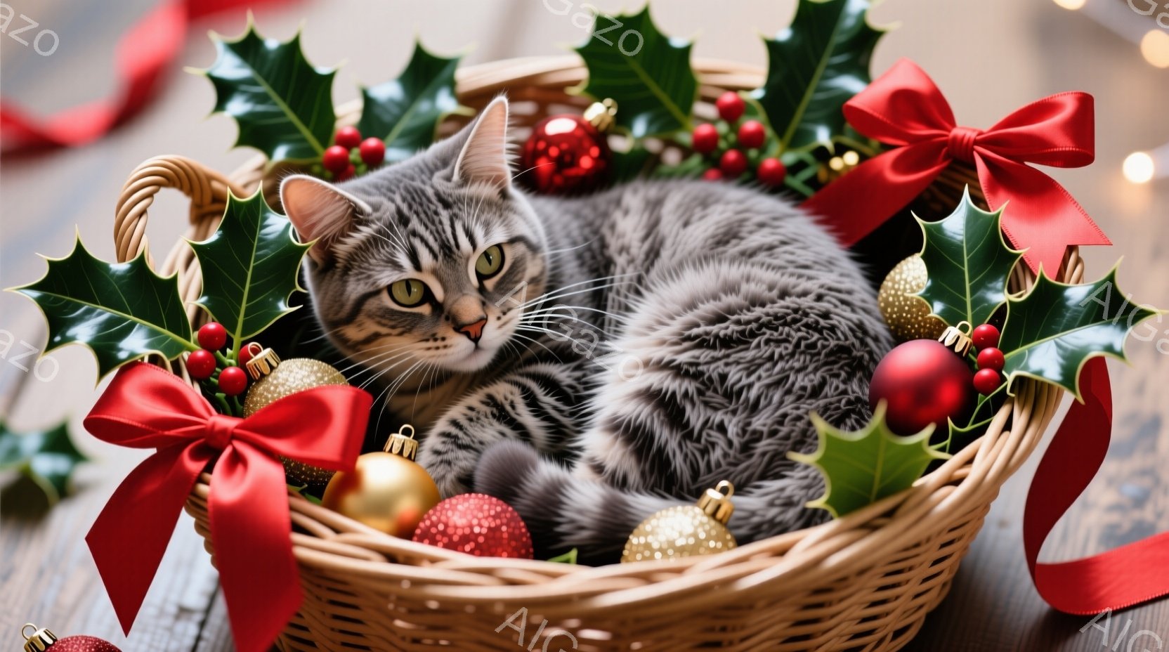 籠の中に、縞模様のグレーの猫が丸まってリラックスして眠っています。籠は赤いリボンと金色のオーナメントで飾られており、背景にはクリスマスツリーの飾りや緑の葉が散りばめられています。暖かく、お祝いの雰囲気があり、クリスマスの季節の愛らしさを感じさせます。