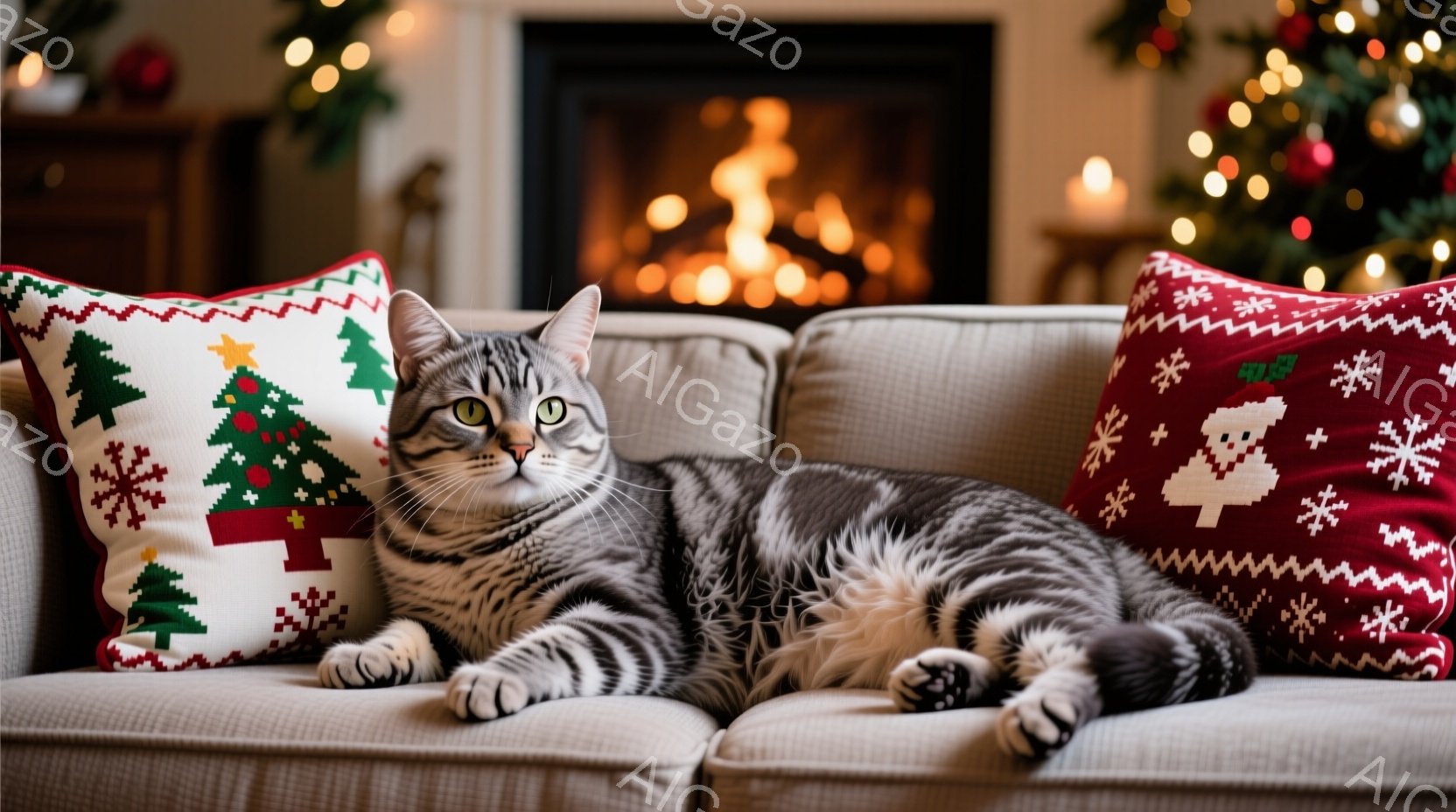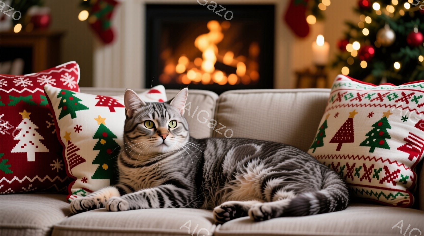 灰色の縞模様の猫が、クリスマスの柄のクッションが置かれたクリーム色のソファに横たわっています。猫はリラックスした表情でカメラを見つめており、穏やかで居心地の良い雰囲気を醸し出しています。背景には暖炉の火と、ぼやけたクリスマスツリーが見え、冬の暖かく心地よいシーンが表現されています。