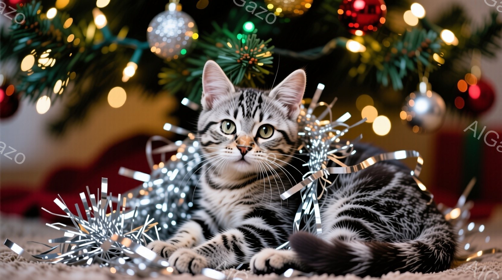 白地に黒の縞模様の愛らしい子猫が、銀色のキラキラした飾りの中に横たわっています。子猫は前足を伸ばし、リラックスした様子で、好奇心旺盛な表情でカメラを見つめています。背景にはクリスマスツリーの緑と、赤や金のオーナメントが輝き、温かくお祝いムードにあふれています。