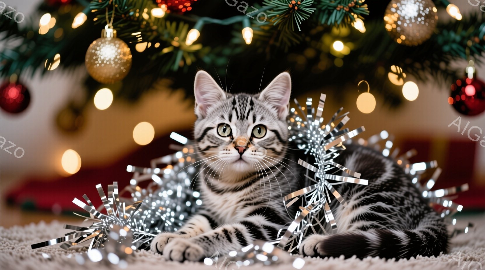 白と黒の縞模様の小さな子猫が、クリスマスツリーの足元で銀色のガーランドにじゃれついている。子猫は丸く体を丸め、好奇心と遊び心に満ちた表情でカメラを見つめている。背景には緑豊かなクリスマスツリーと、暖かく輝く電飾がぼんやりと見え、祝祭の雰囲気を醸し出している。