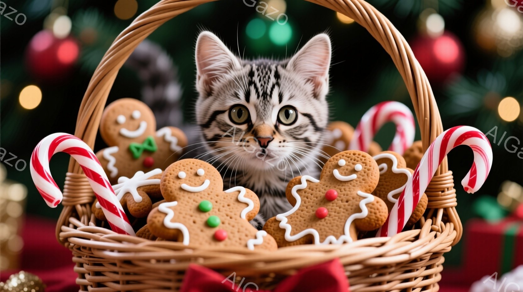 籠の中に、縞模様の可愛らしい子猫が座っており、大きな緑色の目で見つめています。籠の中には、クリスマスのジンジャーブレッドマンとキャンディケーンが並べられており、背景にはぼやけたクリスマスツリーの飾りが見えます。全体的に、暖かく、可愛らしく、お祝いの雰囲気が漂う、クリスマスの季節にぴったりの写真です。