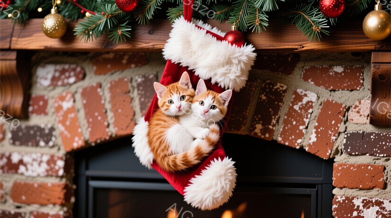 赤いクリスマスストッキングの中に、オレンジと白の毛並みを持つ子猫が丸まって眠っています。子猫は穏やかな表情で、リラックスした様子が伺えます。背景にはレンガ造りの暖炉と、緑色のクリスマスツリーの飾りが見え、暖かくお祝いムードに満ちた雰囲気です。