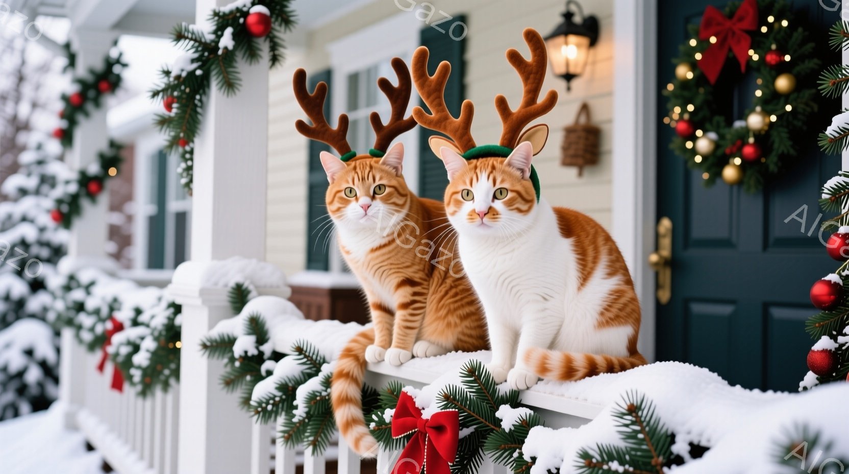 白とオレンジ色の猫が、クリスマスのトナカイの角を付けて白い手すりに座っています。背景には、クリスマスリースや装飾が施された玄関があり、雪が降る冬の風景が広がっています。全体的に、温かく、お祝いの雰囲気が漂う、可愛らしい光景です。