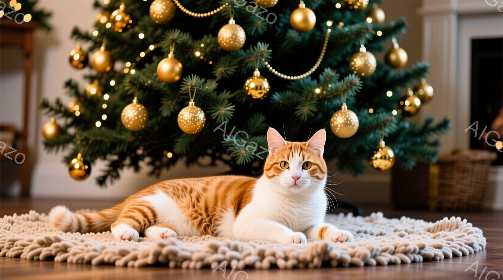 明るいリビングルームで、オレンジと白の猫が円形のラグの上でゆったりと横たわっています。背景には、オーナメントで飾られたクリスマスツリーと、プレゼントの箱が見え、暖炉の火が暖かさを添えています。全体的に、リラックスした、お祝いの雰囲気が漂っています。