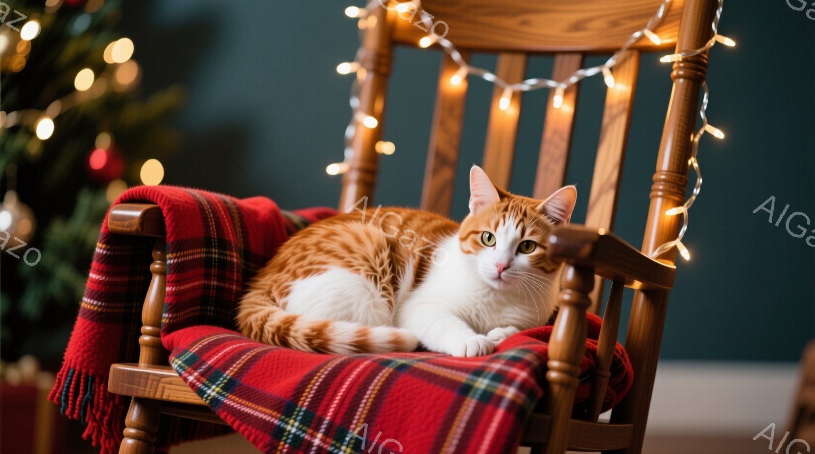 オレンジと白の毛並みの猫が、チェック柄の赤いブランケットが掛けられたロッキングチェアにゆったりと横たわっています。猫はリラックスした表情で、わずかに目を細めています。背景にはぼやけた家具が見え、暖かい光のストリングライトが飾られており、居心地の良い、穏やかな雰囲気を醸し出しています。