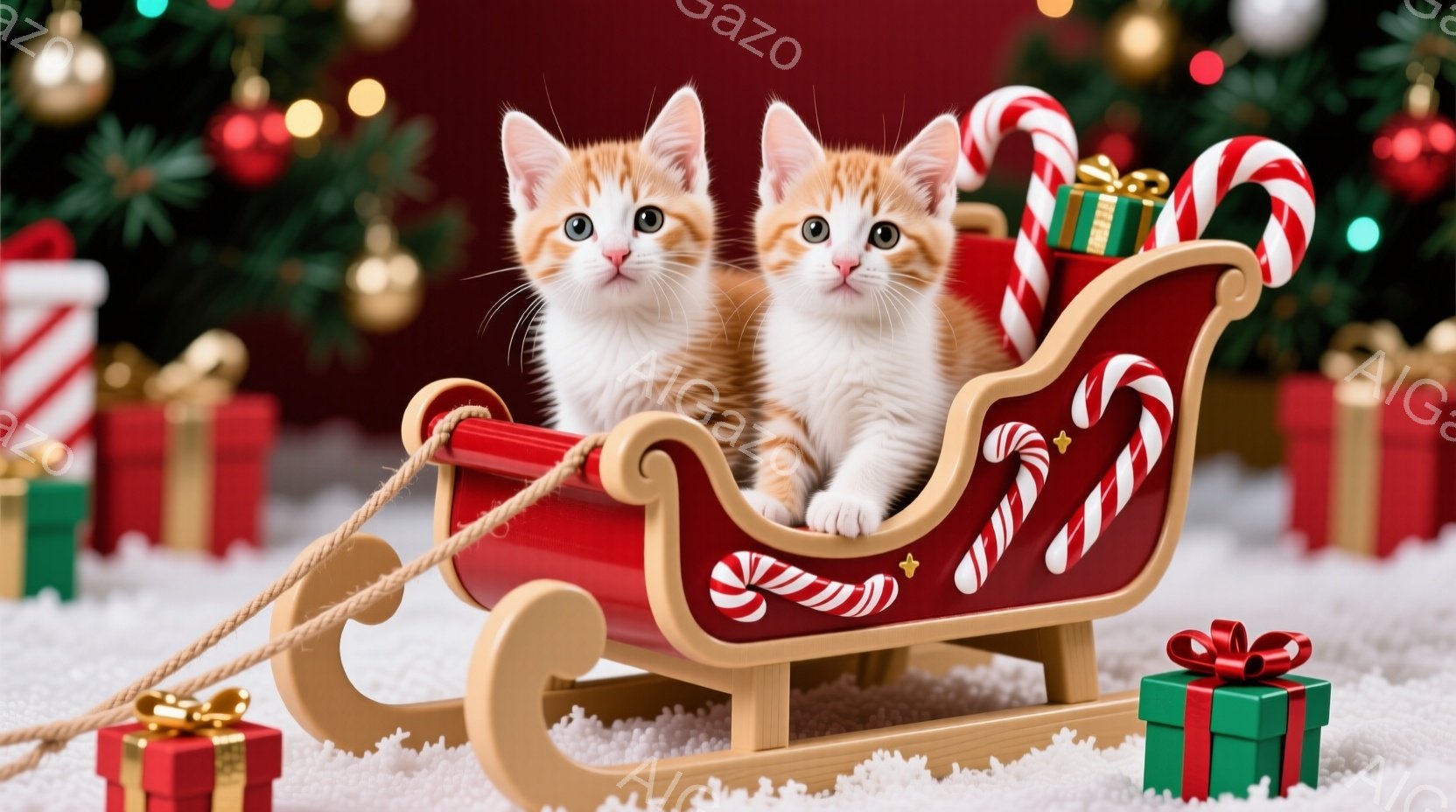 赤毛と白毛の二匹の子猫が、赤いそりに並んで座っています。子猫たちは前を向き、興味津々な表情でこちらを見ており、そりの周りにはキャンディケーンと緑と赤のリボンで飾られたプレゼントボックスが置かれています。背景にはクリスマスツリーがぼやけて見え、全体的に暖かく、お祝いの雰囲気が漂っています。
