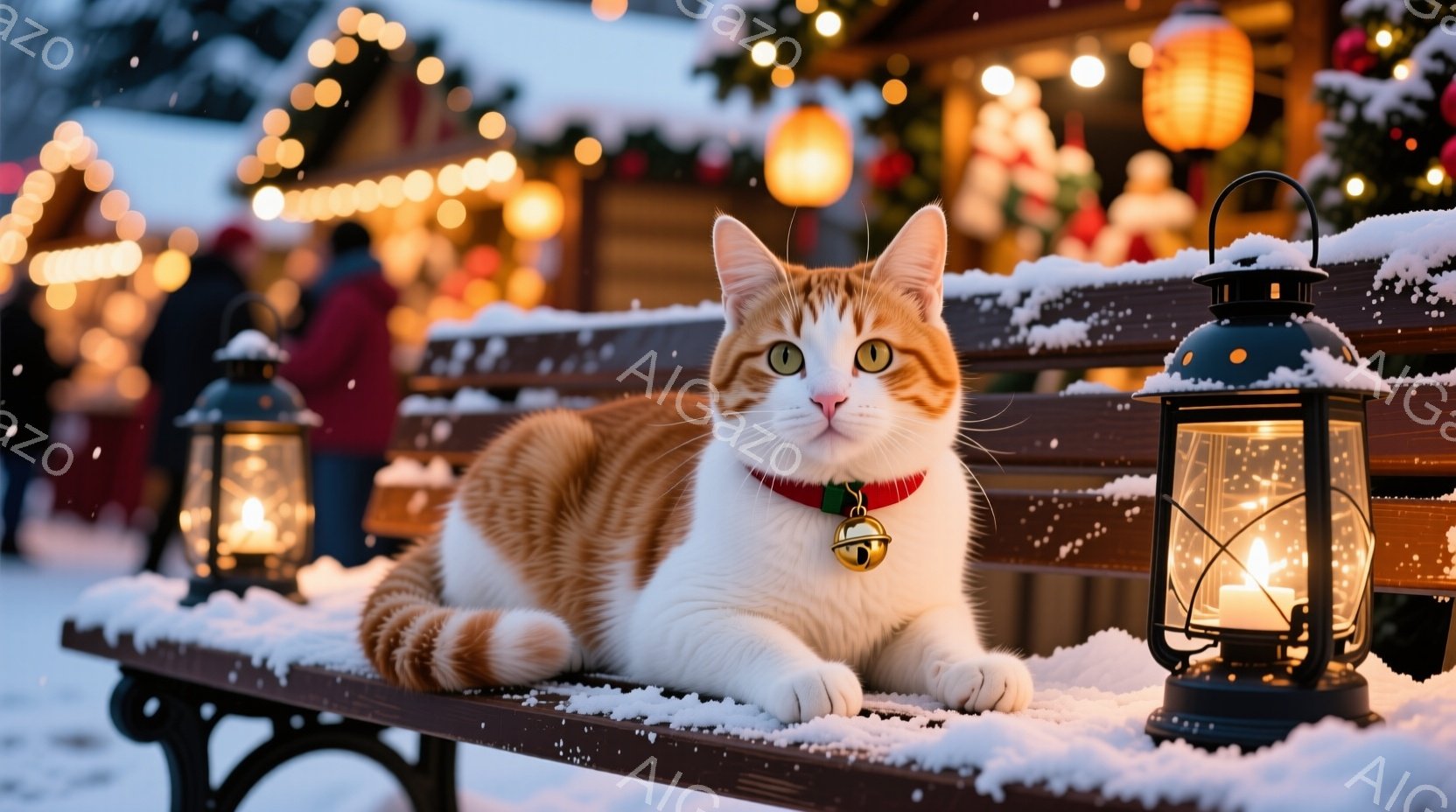 白とオレンジ色の縞模様の猫が、雪が降る冬のベンチに横たわっています。猫は赤い首輪に金のベルが付いており、正面を見て穏やかな表情をしています。背景には、ぼやけたクリスマスマーケットのような賑わいと、キラキラと輝くイルミネーション、そして降り積もる雪が見え、冬の暖かい雰囲気を醸し出しています。