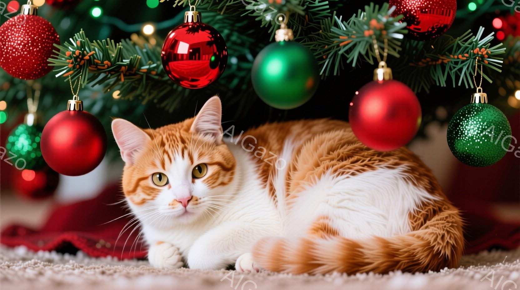 白とオレンジ色の猫が赤い敷物の上で横たわっており、リラックスした表情で正面を見つめている。背景には、赤い、緑色、そして金色のクリスマスオーナメントで飾られたクリスマスツリーがあり、背景はクリスマスらしい暖かい雰囲気を醸し出している。猫の毛並みは柔らかく、光沢があり、クリスマスツリーの輝きと調和している。