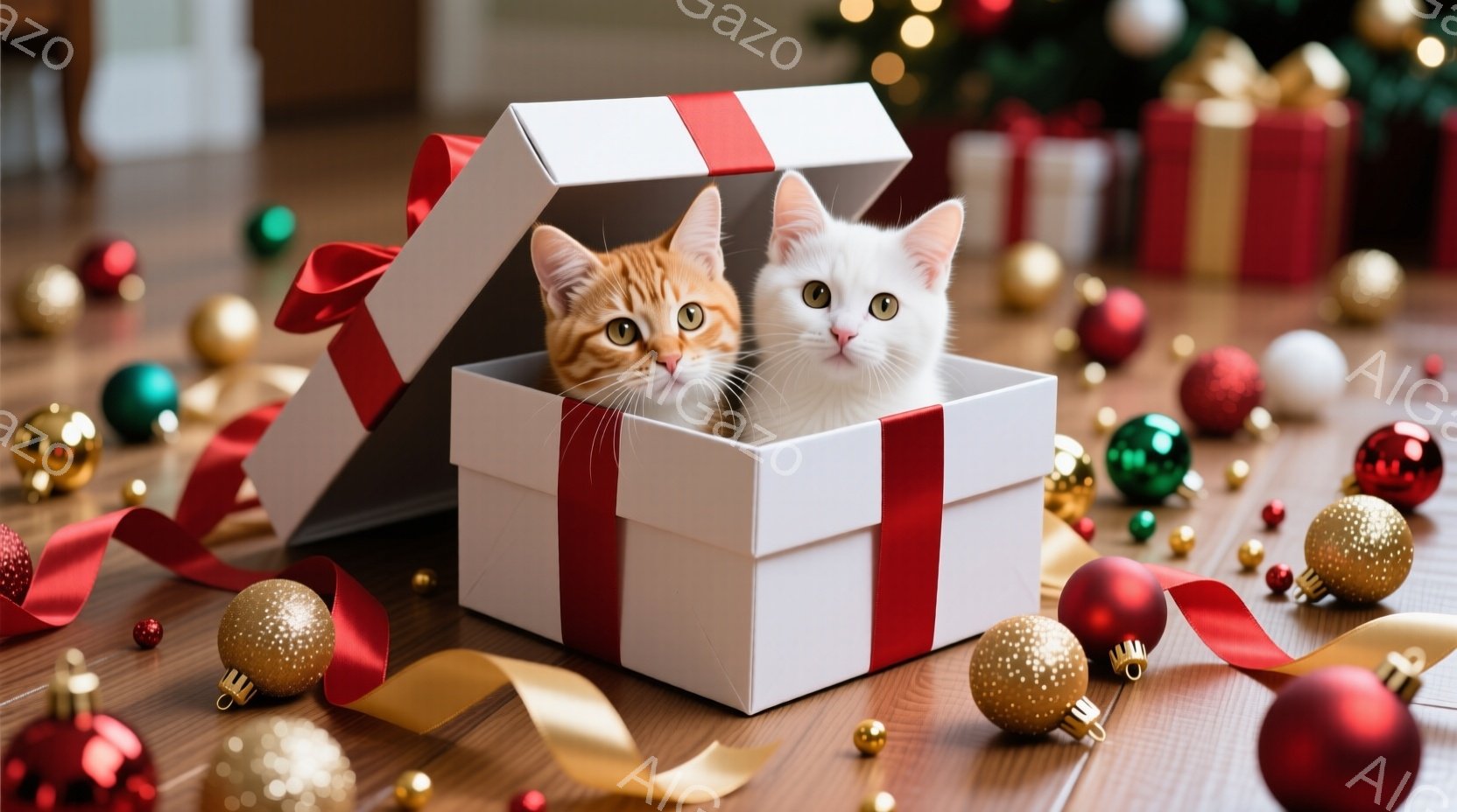2匹のオレンジと白の縞模様の猫が、赤いリボンで結ばれた白いギフトボックスの中から顔を出しています。猫たちは好奇心と少しの戸惑いを見せる表情で、カメラの方を見ています。背景にはクリスマスのオーナメントやデコレーションが散らばり、木製の床が暖かく、お祝いの雰囲気を醸し出しています。