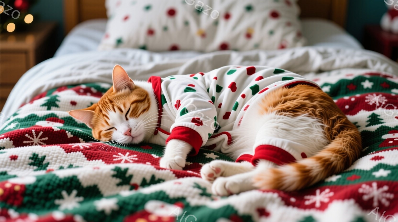 オレンジ色の猫が、クリスマス柄のセーターを着てベッドの上で横たわっています。猫は目を閉じ、リラックスした表情で、前足を体の下に丸めて眠っているようです。背景には、ぼやけたクリスマスツリーが見え、暖かく穏やかな雰囲気を醸し出しています。