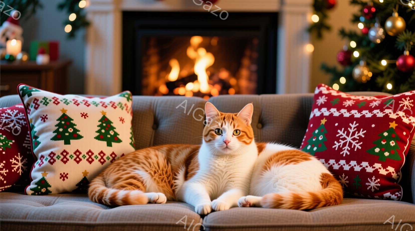 オレンジと白の毛並みの猫が、クリスマスオーナメントと赤いリボンで飾られたバスケットの中に丸まって横たわっています。背景には、ホーリーや赤い実、そしてぼやけたクリスマスツリーの光が散りばめられており、温かくお祝いムードに包まれています。猫はリラックスした表情で、穏やかで平和な雰囲気を醸し出しています。