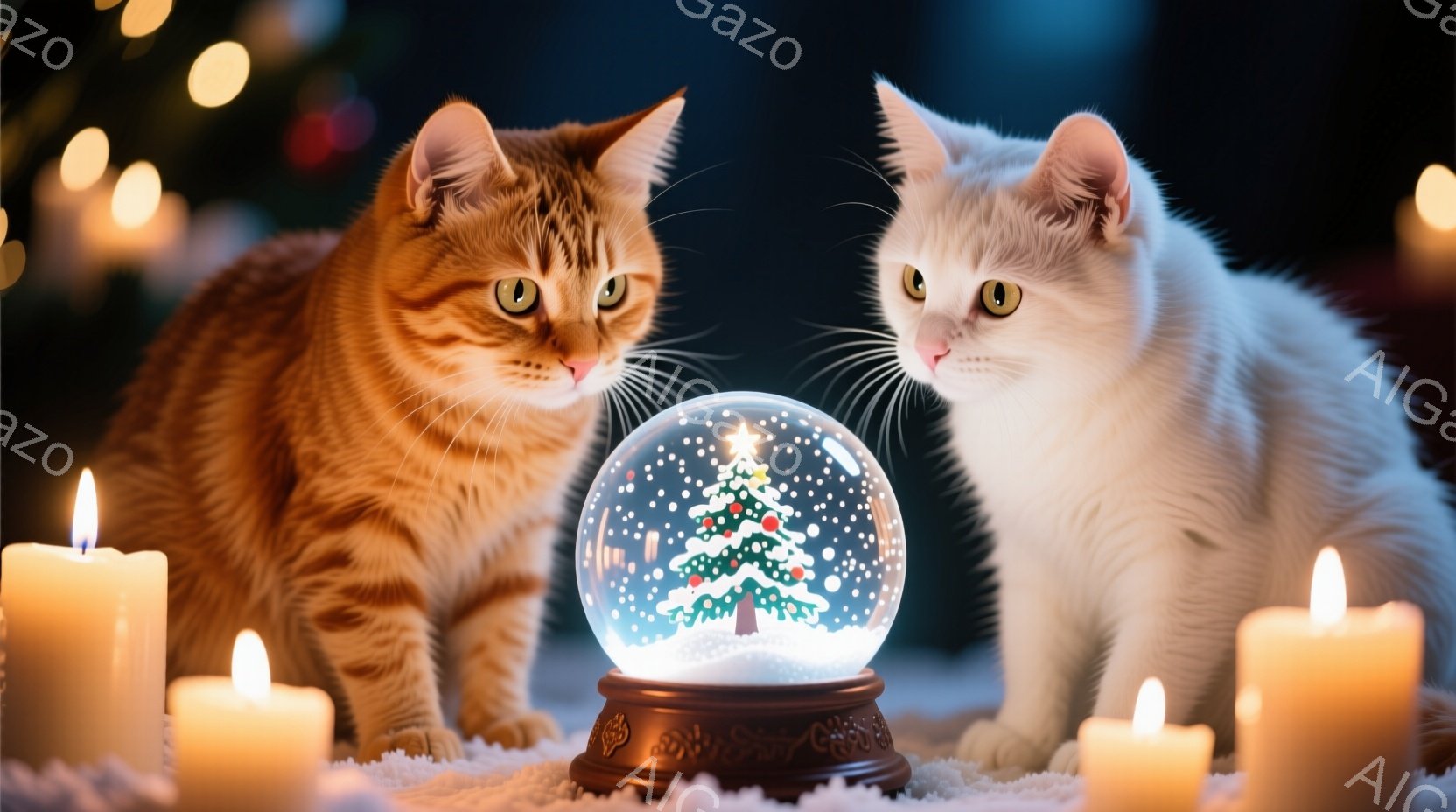 この無料AI生成画像「暖炉の装飾が施された柵の上に、オレンジ色のタビー猫と白い猫が並んで座っており、それぞれ赤い蝶ネクタイを付けている。背景には、雪景色の中にライトアップされた建物が並ぶ冬の街並みが広がり、クリスマスの雰囲気が漂っている。猫たちは正面を見据え、穏やかでリラックスした表情をしている。」は、2025年10月25日に作成されました。 サイズは 1664×928px の高解像度で、商用利用も可能なフリー素材として提供しています。