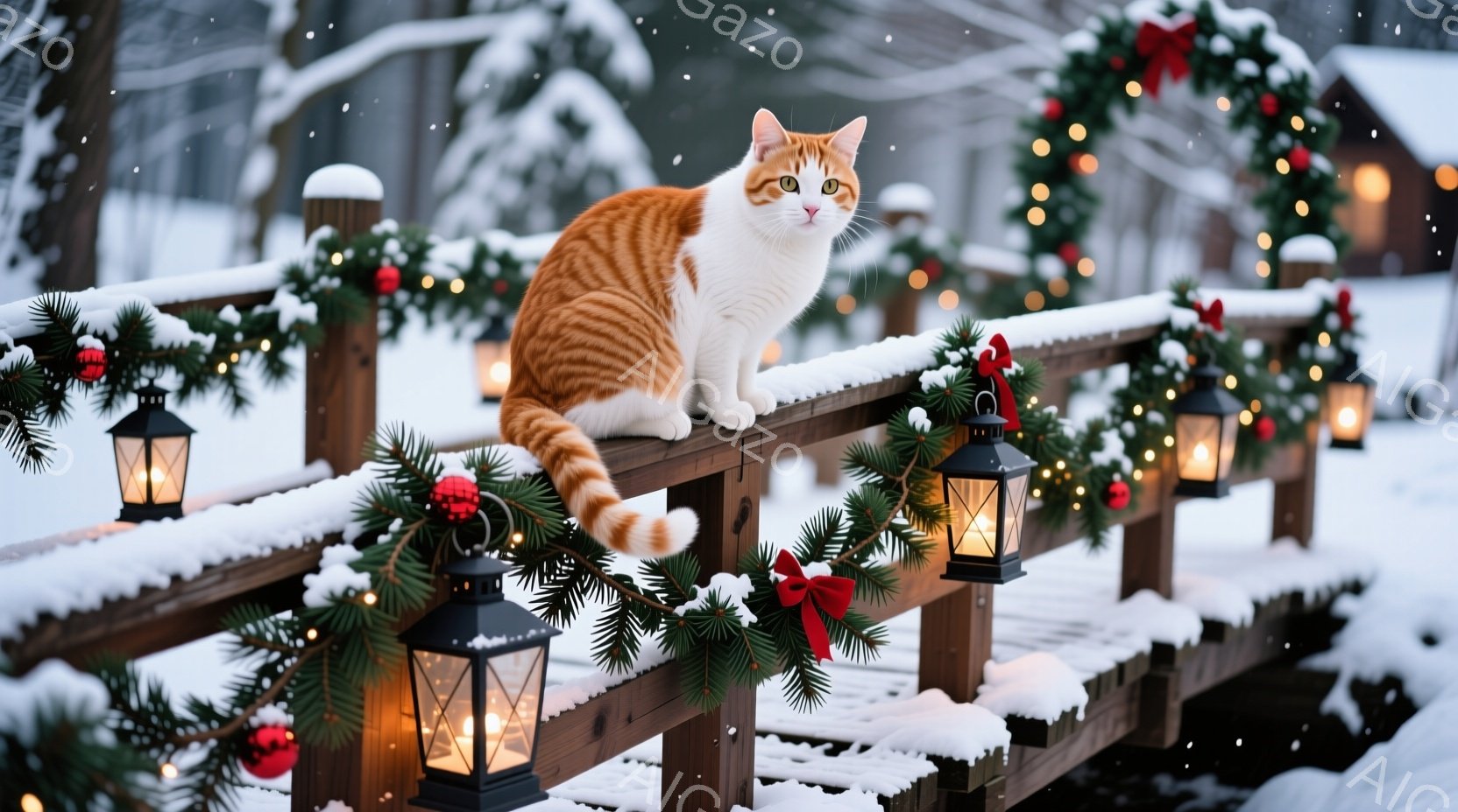雪に覆われた木製の橋の上に、二匹のオレンジ色の猫が並んで座っています。橋の手すりには、松の飾りと赤いリボンが飾られ、その両脇には点灯したランタンが並び、冬の暖かい雰囲気を演出しています。背景は雪景色で、穏やかで静かな冬の日の様子が伝わってきます。