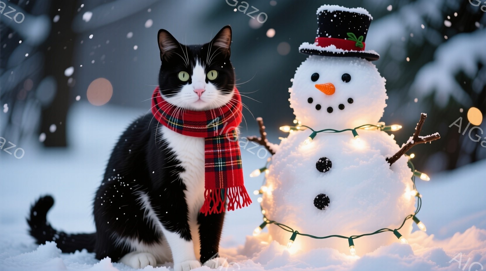 雪景色の中に、手作りの雪だるまと黒白の猫が並んでいます。猫は赤と緑のチェックの暖かいマフラーを巻いており、前足でしっかりと座って、カメラを見つめています。背景には、点灯したイルミネーションと雪に覆われた木々が見え、穏やかで温かい冬の雰囲気が漂っています。