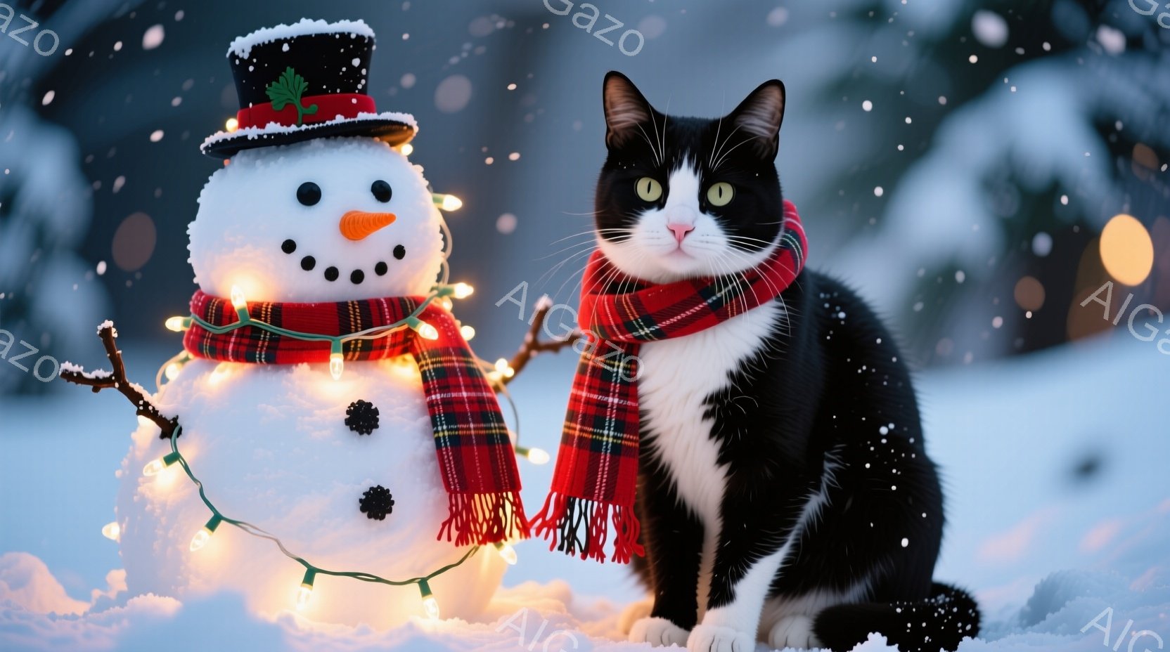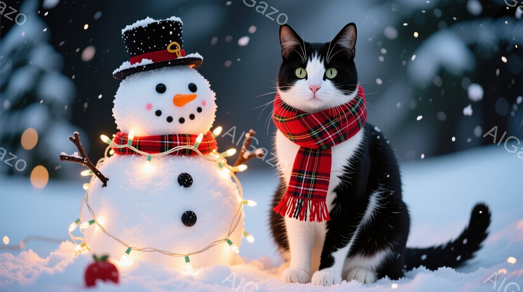 白黒の猫が雪の中に座り、赤いチェック柄の暖かいスカーフを巻いています。隣には雪だるまが立っており、頭には黒い帽子、鼻にはニンジン、口には小石が使われ、カラフルなイルミネーションライトが体を飾っています。背景には雪に覆われた木々と、ぼやけた光の粒子が散りばめられており、穏やかで冬の温かい雰囲気を醸し出しています。