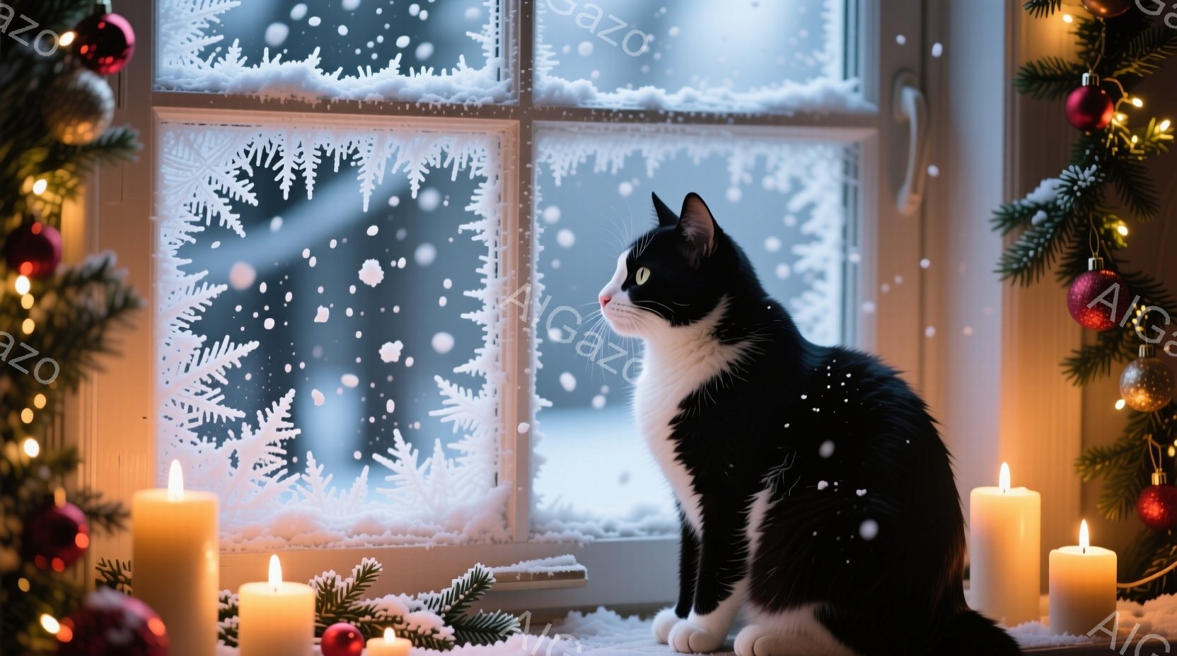 白黒の猫が窓辺に座り、雪景色を眺めている。窓には雪の結晶模様が描かれており、暖かく光るキャンドルが猫の周りに置かれている。背景にはクリスマスツリーの緑が映り、温かく穏やかな冬の雰囲気を醸し出している。