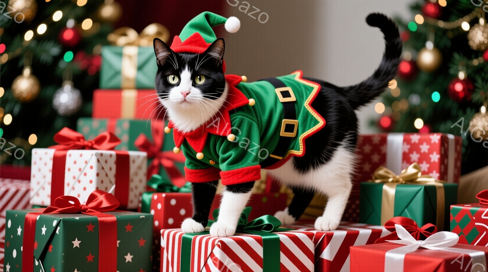 この無料AI生成画像「白と黒の猫が、編み物のブランケットが敷かれたロッキングチェアに丸まって座っています。猫はリラックスした表情で、わずかに目を細めています。背景にはぼやけたクリスマスツリーと、暖色の電飾が見え、穏やかで心地よい雰囲気が漂っています。」は、2025年10月25日に作成されました。 サイズは 1664×928px の高解像度で、商用利用も可能なフリー素材として提供しています。