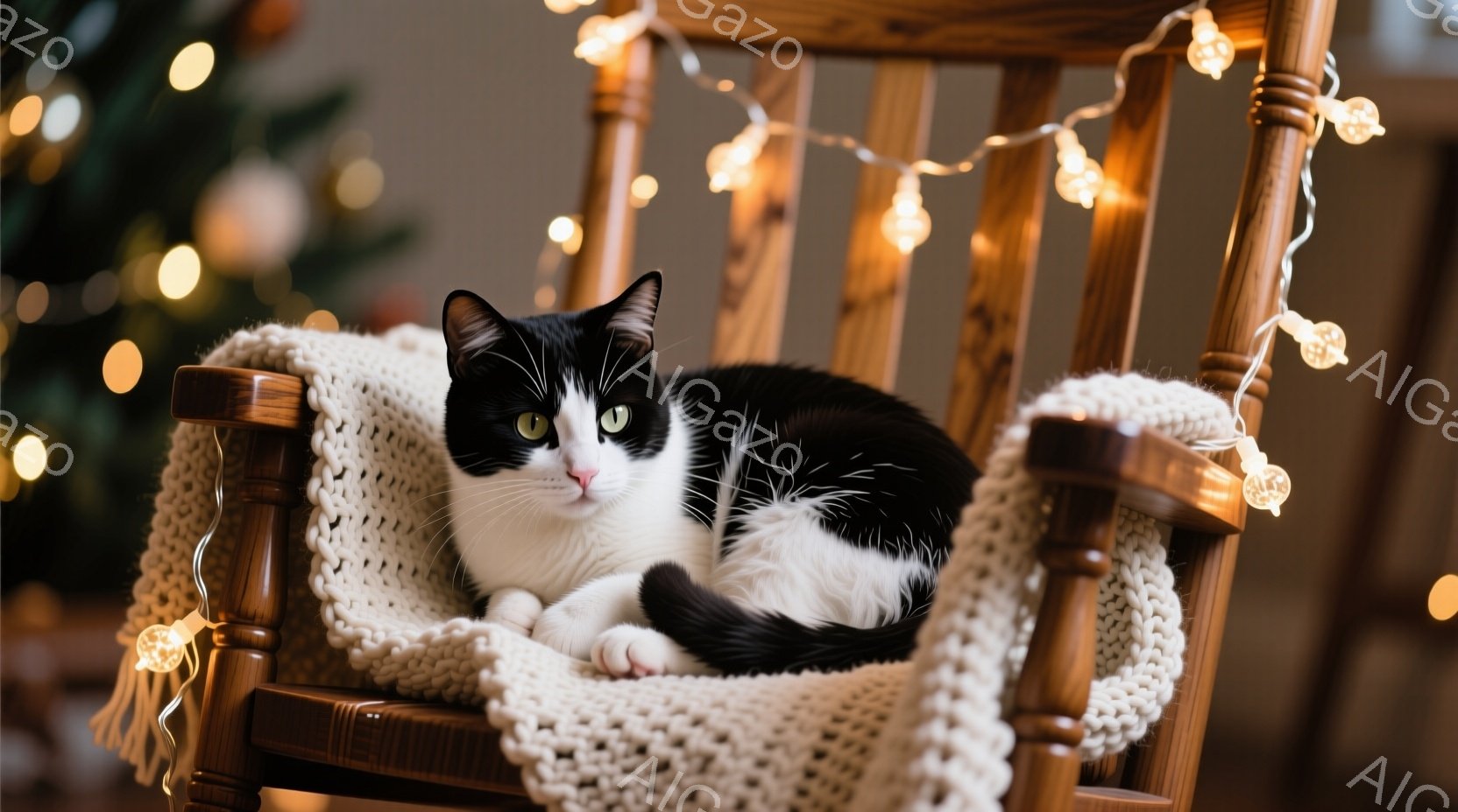 白と黒の猫が、編み物のブランケットが敷かれたロッキングチェアに丸まって座っています。猫はリラックスした表情で、わずかに目を細めています。背景にはぼやけたクリスマスツリーと、暖色の電飾が見え、穏やかで心地よい雰囲気が漂っています。