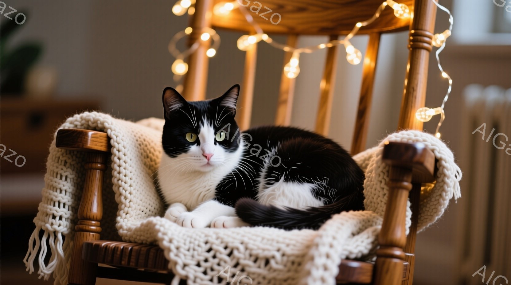 白と黒の猫が、クリーム色のざっくりとした編み物のブランケットが敷かれたロッキングチェアにゆったりと横たわっています。猫はリラックスした表情で、緑色の目を少し閉じ、穏やかな雰囲気を醸し出しています。背景にはぼやけたクリスマスツリーと、温かい光を放つストリングライトがあり、心地よく居心地の良い冬の情景を作り出しています。
