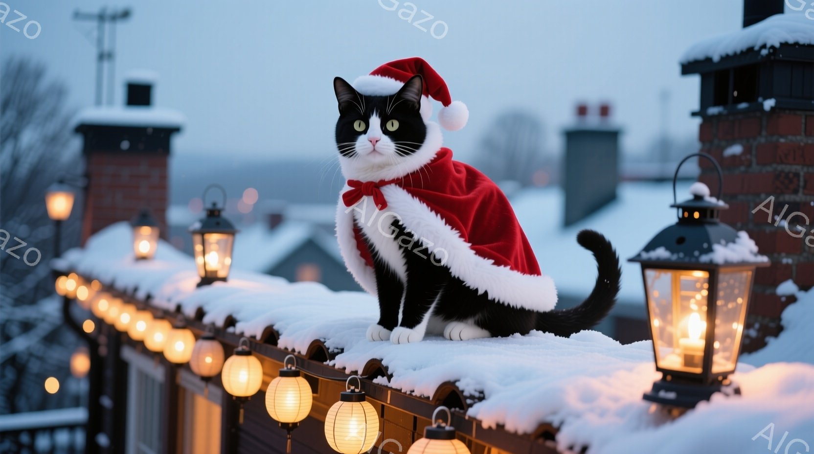 黒と白の猫がサンタクロースの帽子と赤いマントを身に着けて、雪で覆われた屋根の上に座っています。背景には、雪景色と点灯された小さなランタンが並び、冬の暖かく幻想的な雰囲気を醸し出しています。猫は少し横を向き、静かに何かを見つめているようです。