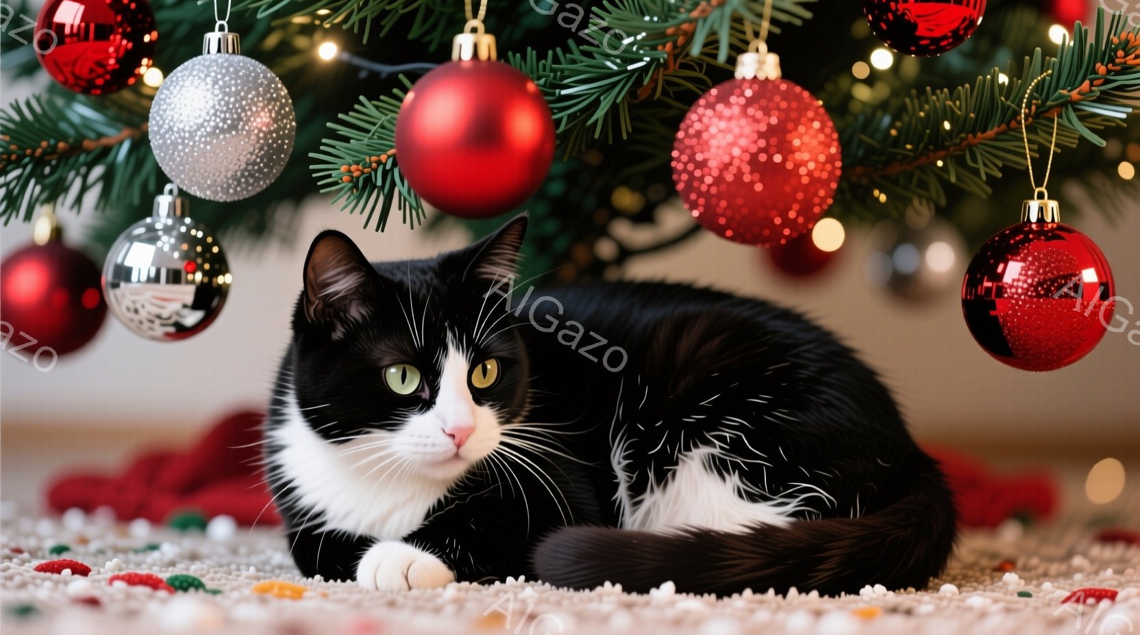 白と黒の猫がカーペットの上に横たわっており、緑色のクリスマスツリーの枝が背景に見えます。猫は正面を見つめ、落ち着いた表情をしています。背景には、赤と銀のクリスマスオーナメントが散りばめられ、温かくお祝いの雰囲気を醸し出しています。