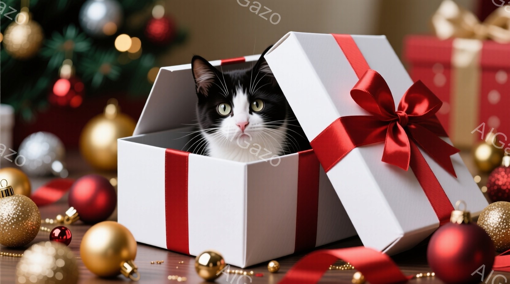 白地に赤いリボンで飾られたギフトボックスの中に、白黒の猫が顔を覗かせています。背景には、様々な色のクリスマスオーナメントが散りばめられ、木製のテーブルの上に雪のようなものが置かれています。温かく、可愛らしいクリスマスの雰囲気が漂う、魅力的な光景です。
