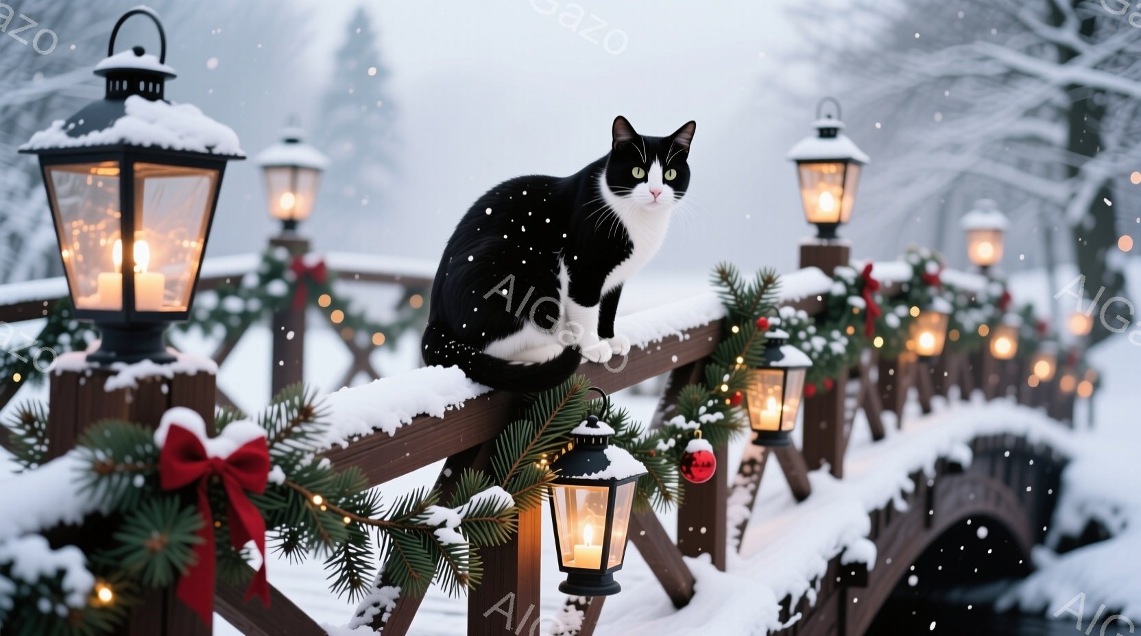 白黒の猫が雪で覆われた橋の欄干に座り、正面を見つめている。橋にはクリスマスツリーの葉と赤いリボン、そして点灯したランタンが飾られ、雪が舞う冬の景色が広がっている。暖かく幻想的な雰囲気で、冬のホリデーシーズンを象徴する光景である。