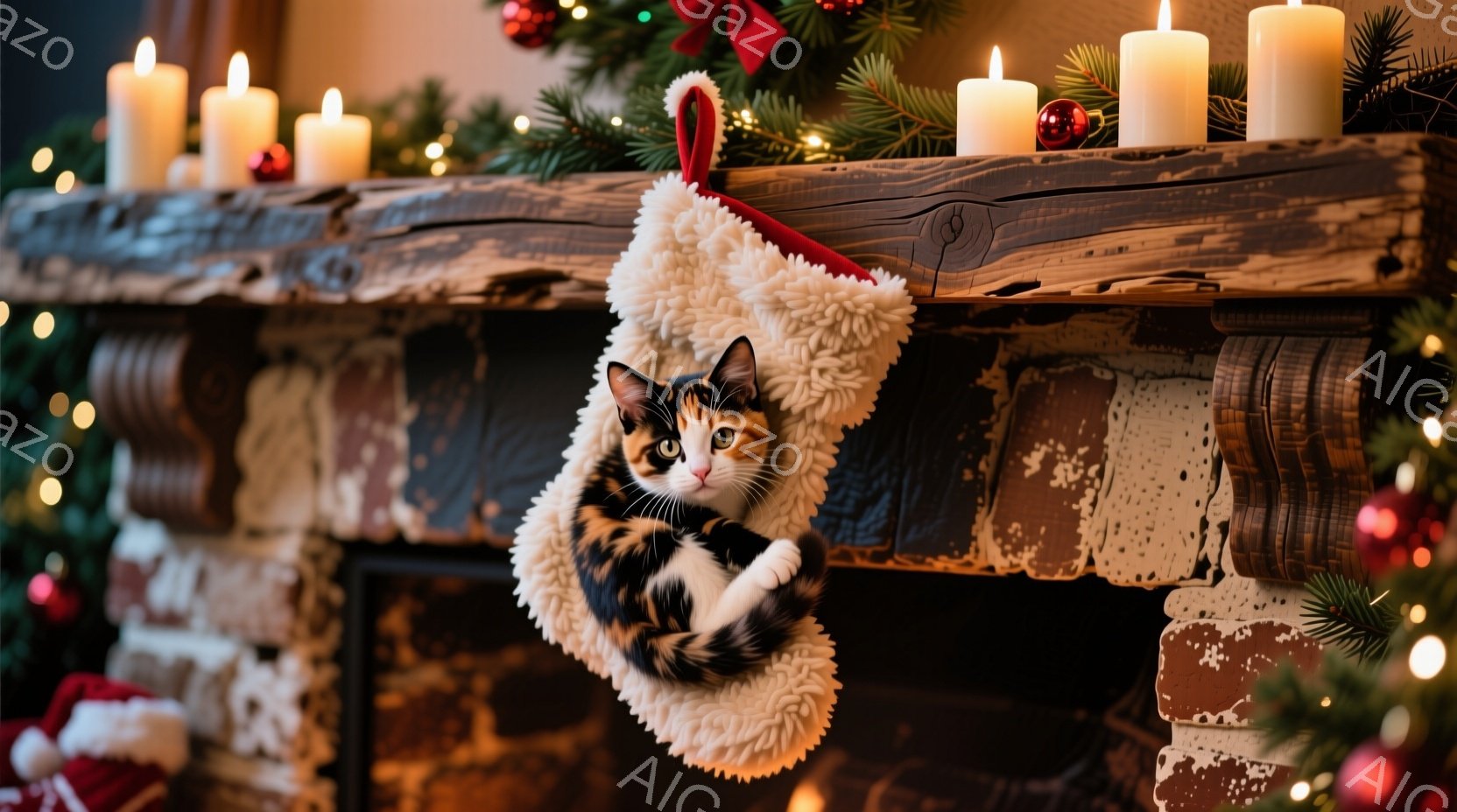 白いクリスマスストッキングの中に、三毛猫が丸まって座っています。背景には、暖炉とクリスマスツリー、そして点灯されたキャンドルが並び、温かく心地よい雰囲気が漂っています。猫はリラックスした表情で、クリスマスの飾り付けと調和して、ほほえましい光景を作り出しています。