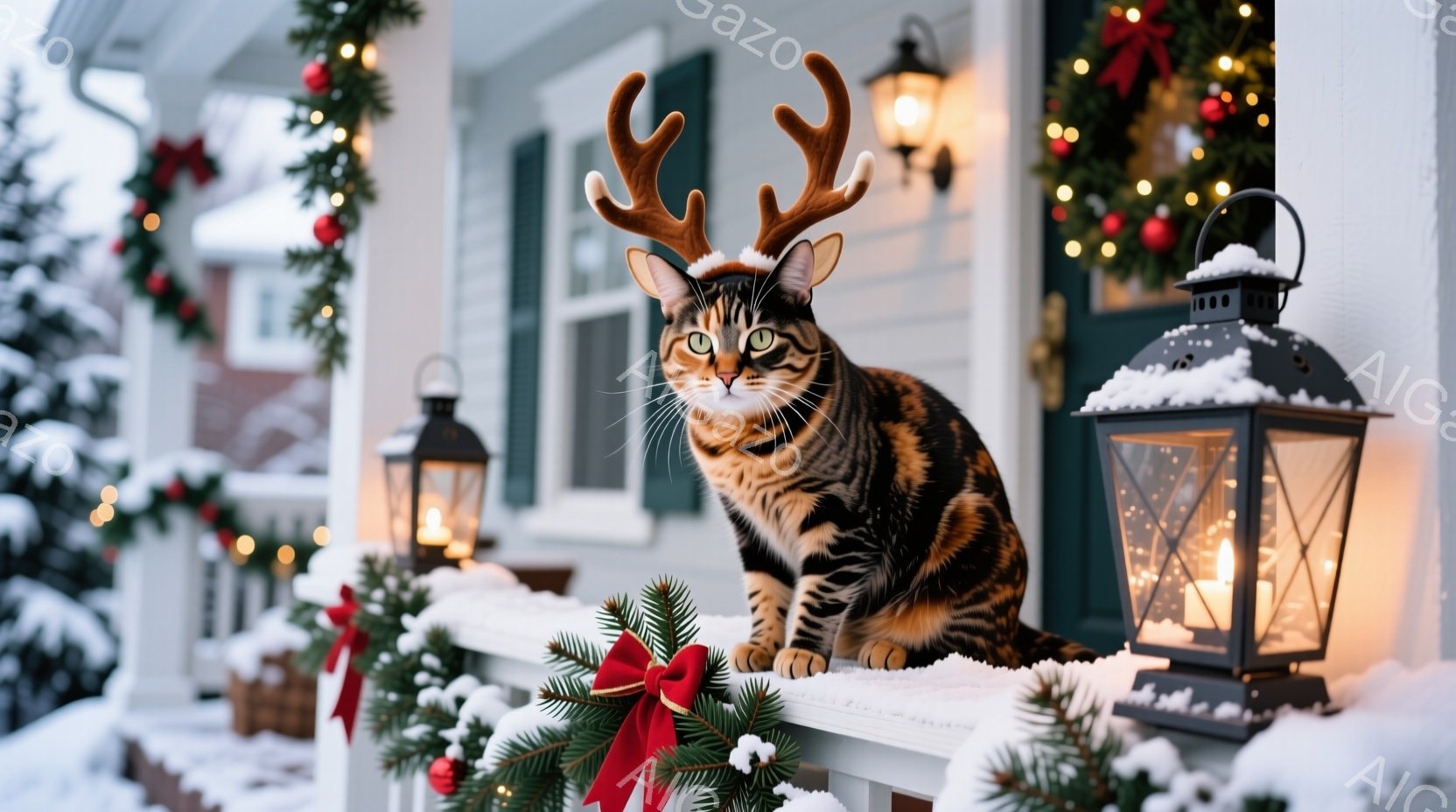 白い雪に覆われた家の柵の上に、角のようなアクセサリーをつけたトラ柄の猫が座っています。背景には、クリスマスリースや点灯したランタンが飾られ、冬の暖かい雰囲気を醸し出しています。猫は正面を向き、少し好奇心と遊び心のある表情を浮かべています。