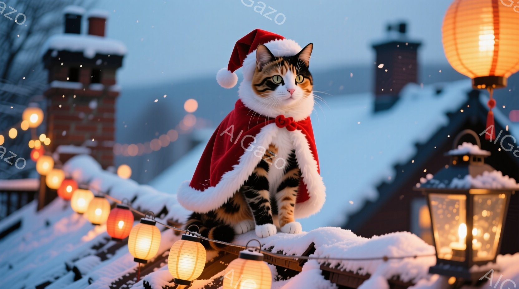 屋根の上に、サンタクロースの帽子とマントを着た猫が座っています。猫は前方を向いており、緑色の瞳がはっきりと見え、落ち着いた表情をしています。背景には雪で覆われた屋根、煙突、そして点灯したランタンが並び、冬の夜の暖かく幻想的な雰囲気を醸し出しています。