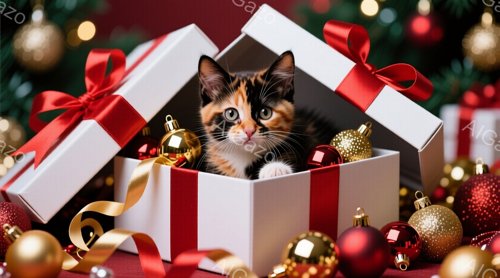 白いギフトボックスの中から、三毛猫が顔を出している可愛らしい写真です。猫は好奇心旺盛な表情で、大きな瞳でこちらを見つめています。背景には、赤や金のクリスマスオーナメントが散りばめられており、全体的に暖かく、お祝いムードに満ちています。