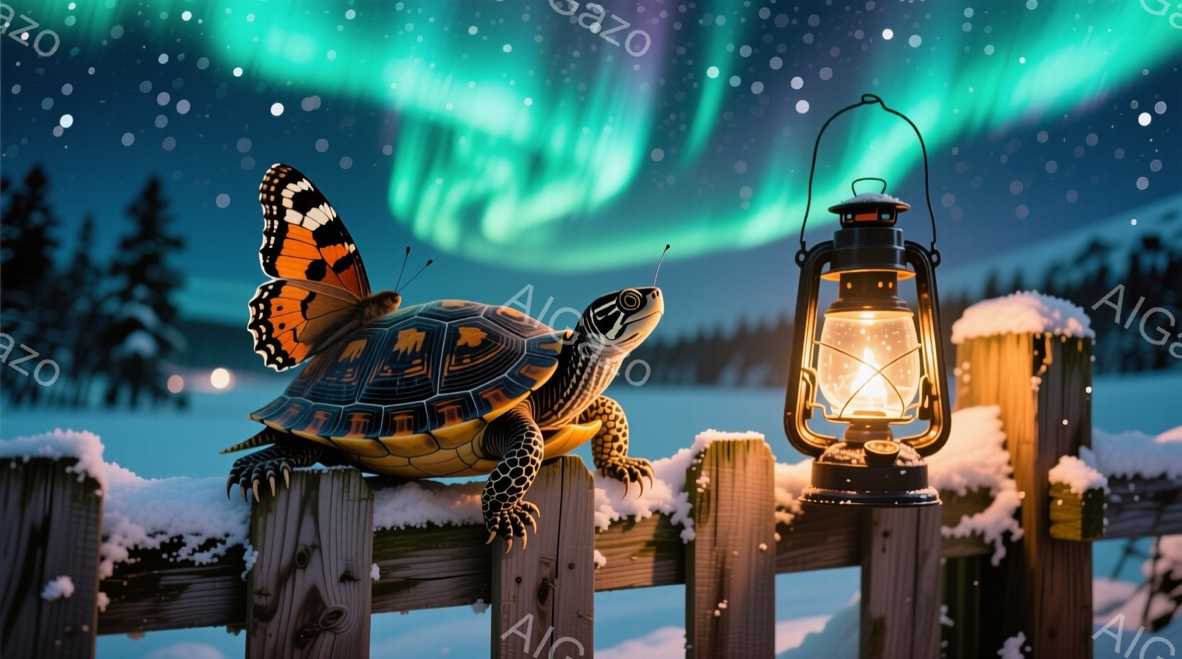 雪に覆われた柵の上で、模様の美しい亀が前足を伸ばして座っている。背景には針葉樹林が広がり、夜空にはオーロラが幻想的に輝いている。暖かく光るランタンが亀の横に置かれ、静かで神秘的な冬の夜の雰囲気を醸し出している。