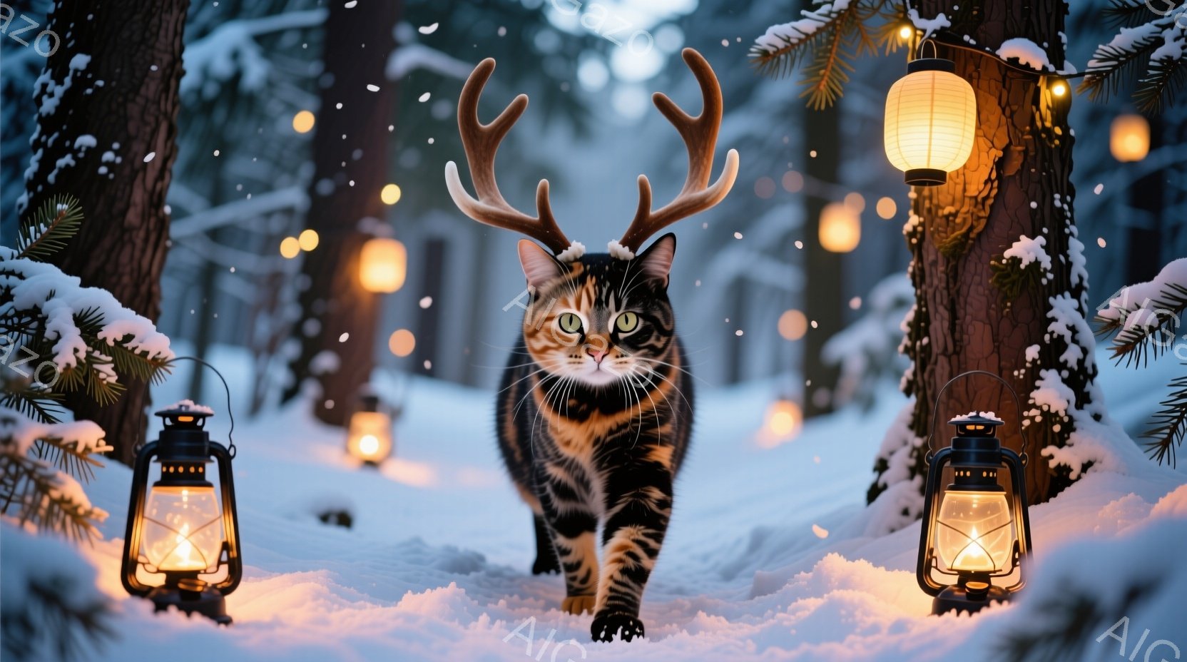 茶色と黒の縞模様の猫が、角のようなものを頭につけて雪の中を歩いている。背景には、点灯したランタンや星型の装飾が飾られた木々が生い茂り、冬の暖かく幻想的な雰囲気を醸し出している。雪は降り積もり、全体的に温かく、おとぎ話のような、穏やかなムードを演出している。
