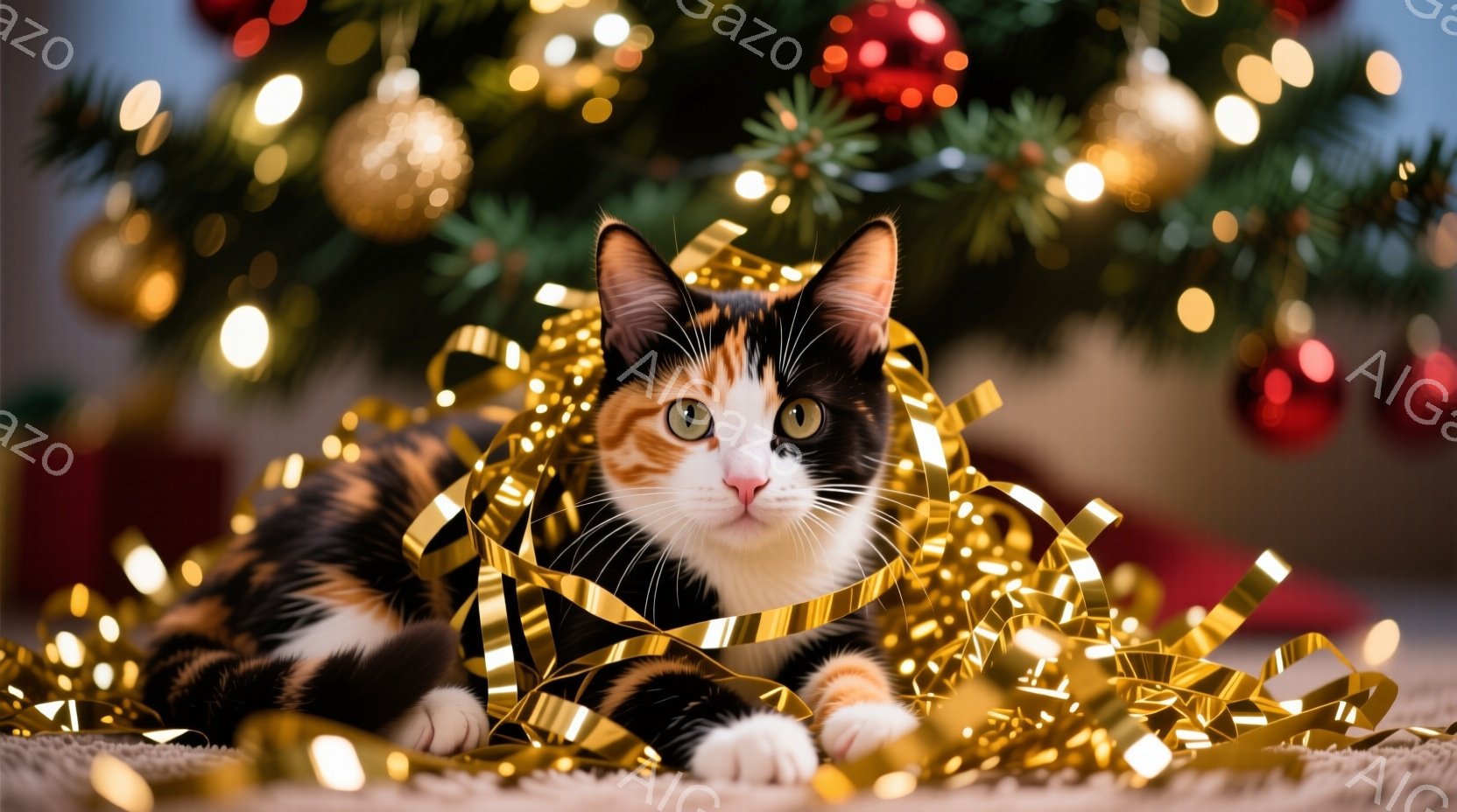 白、黒、オレンジ色の毛並みをした子猫が、金色のリボンに囲まれて床に座っています。子猫は前足を少し伸ばし、好奇心と遊び心に満ちた表情でカメラを見つめています。背景にはぼやけたクリスマスツリーと光が散りばめられており、暖かく、お祝いムードに満ちた雰囲気です。