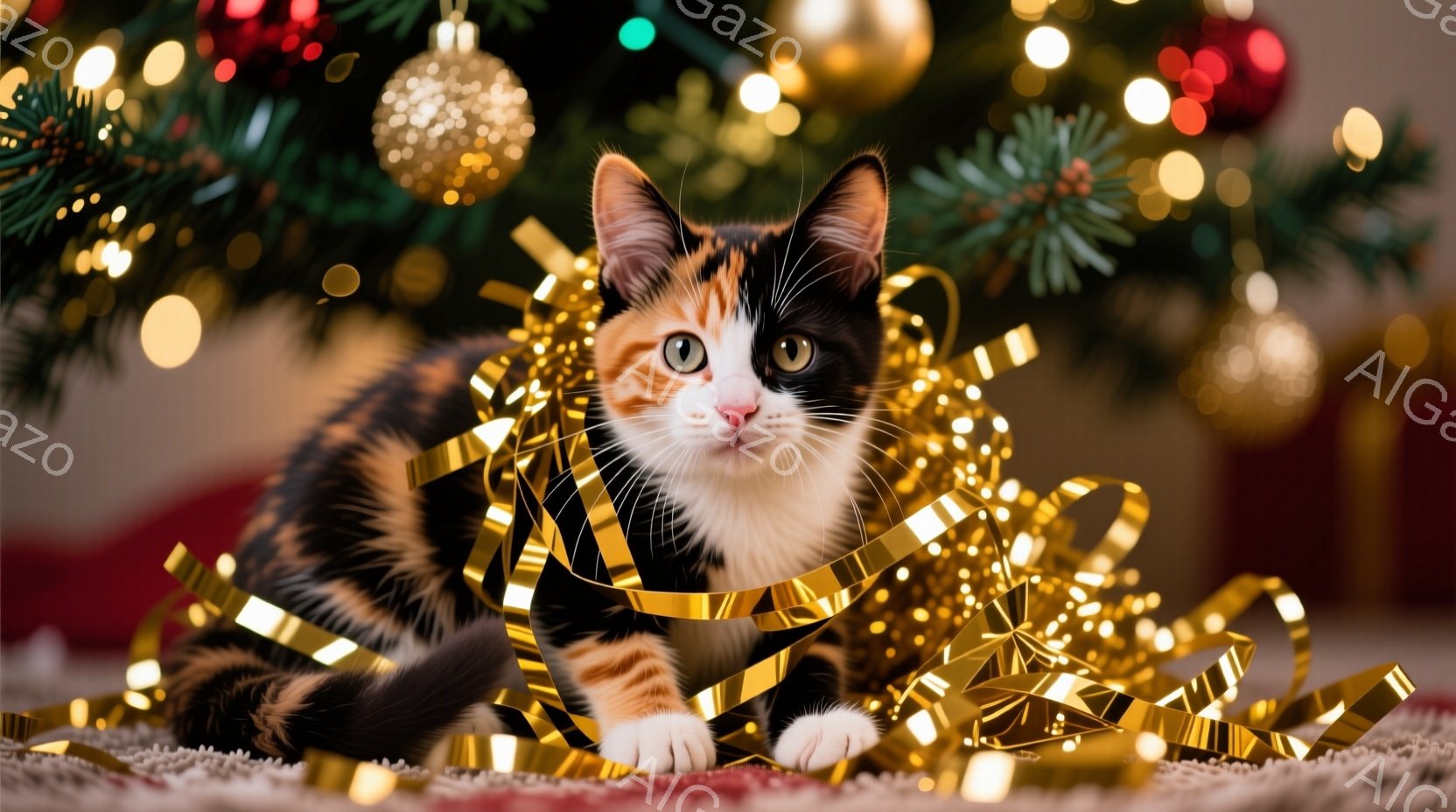白、黒、オレンジ色のまだら模様の猫が、金色のガーランドに囲まれて床に丸まって横たわっています。猫は緑色の目を輝かせ、リラックスした表情を浮かべています。背景には、ぼやけたクリスマスツリーとキラキラと光る電飾が見え、お祝いムードを醸し出しています。