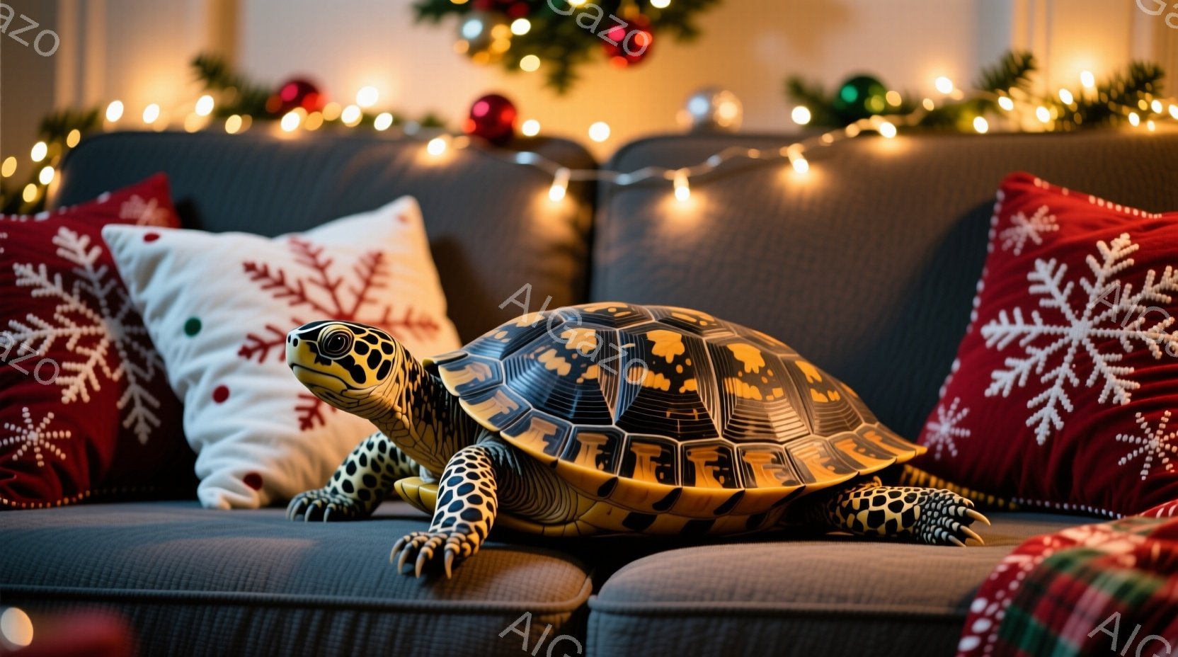 ソファの上で甲羅が美しいカメがリラックスして横たわっています。背景には、クリスマスを意識した模様のクッションや、温かい光を放つイルミネーションが飾られています。全体的に、温かく、居心地の良い、そして少し遊び心のある雰囲気が漂っています。