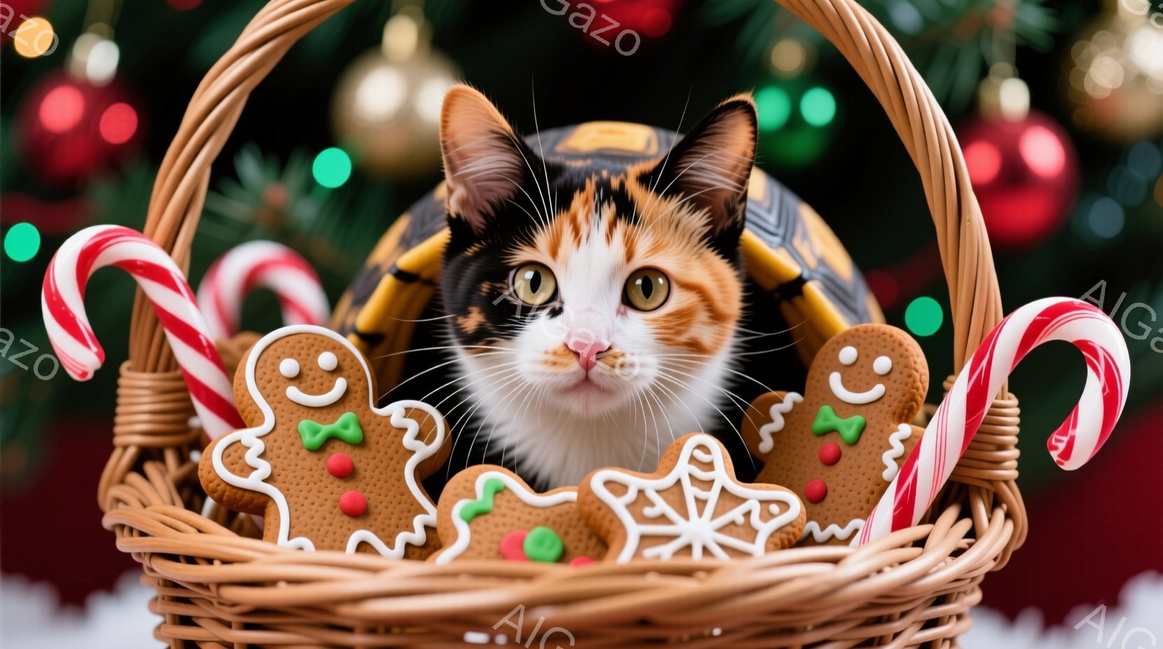 籠の中に、三毛猫が顔を出しています。籠の中には、ジンジャーブレッドマンやキャンディケーンが散りばめられており、背景にはクリスマスツリーの飾りが見えます。全体的に暖かく、お祝いの雰囲気が漂っています。