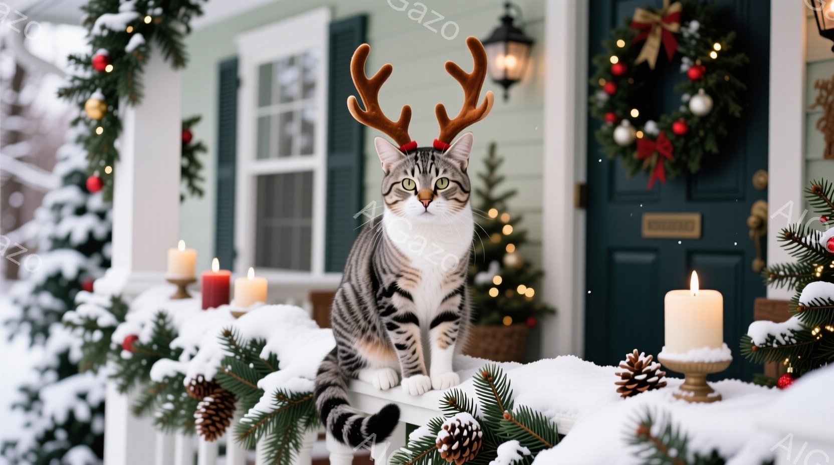 白い雪に覆われた家の柵の上に、灰色の縞模様の猫が座っています。猫は小さなトナカイの角を頭につけており、穏やかで少し退屈そうな表情をしています。背景にはクリスマスデコレーションの装飾が施された家があり、全体的に穏やかで冬のホリデーシーズンを象徴する雰囲気です。