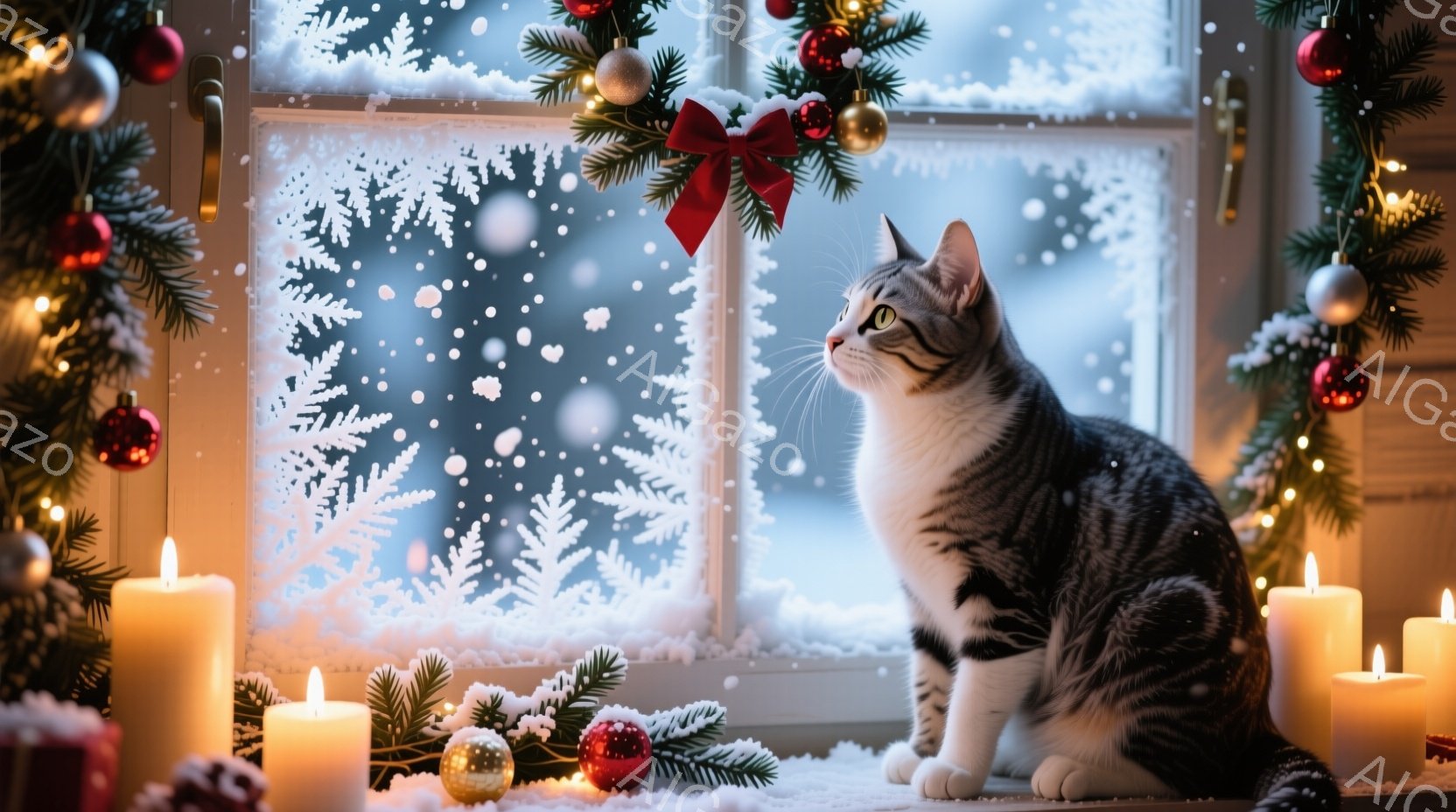 この無料AI生成画像「白い足と縞模様の毛並みを持つ猫が、チェック柄の暖かいスカーフを首に巻いて雪の上に座っています。猫は前を向き、わずかに微笑んでいるように見え、その隣には、同様のチェック柄のスカーフを巻き、小さな帽子と炭でできた目鼻口を持つ雪だるまが立っています。背景にはぼやけた木々が見え、雪が舞う冬の静かな風景が広がっています。」は、2025年10月25日に作成されました。 サイズは 1664×928px の高解像度で、商用利用も可能なフリー素材として提供しています。