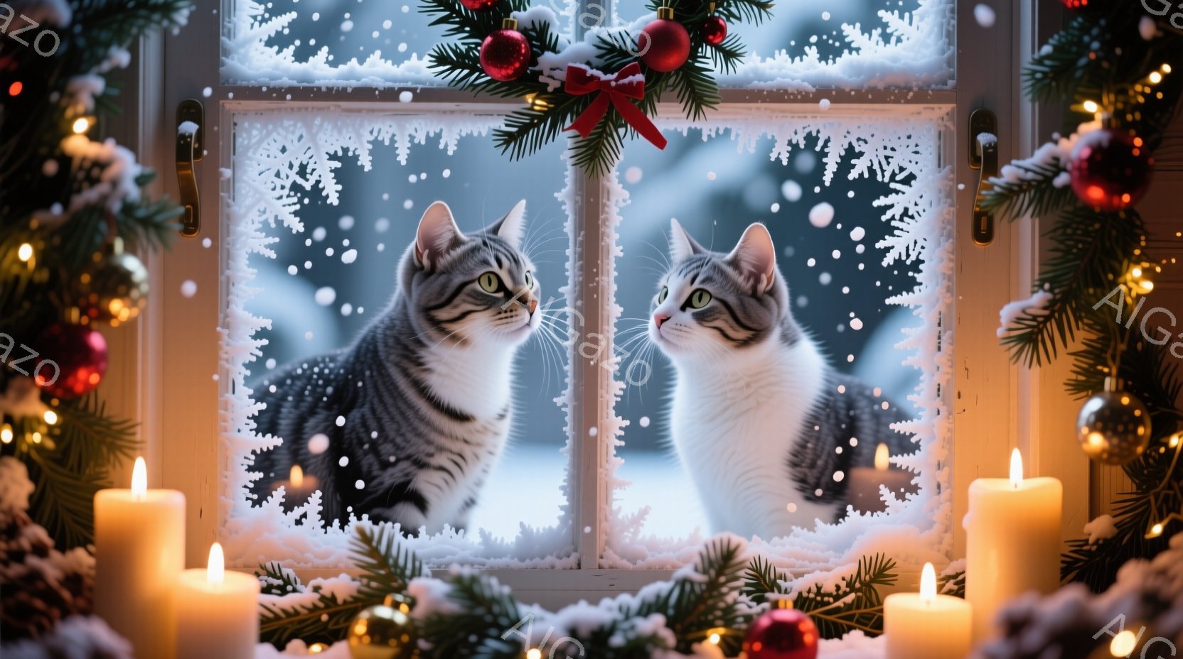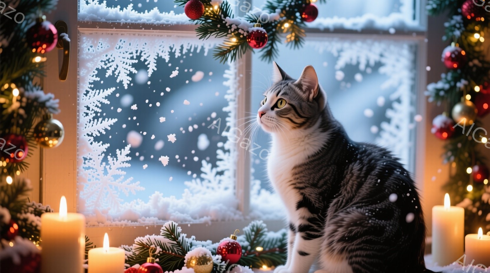 白い窓枠に飾られたクリスマスリースと赤いリボンを背景に、グレーと白の縞模様の猫が窓の外を眺めている。雪が舞い散る冬の景色が猫の視線の先に広がり、窓辺には点灯されたキャンドルと装飾が暖かく輝いている。全体的に、温かく穏やかなクリスマスの雰囲気を醸し出している。