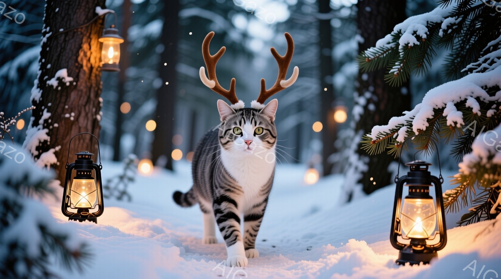 この無料AI生成画像「雪に覆われた柵の上に、縞模様の猫が座って遠くを見つめている。背景には緑色のオーロラが夜空を彩り、雪景色と合わせて幻想的な雰囲気を醸し出している。古風なランタンが柵に寄りかかっており、暖かく穏やかな光を放っている。」は、2025年10月25日に作成されました。 サイズは 1664×928px の高解像度で、商用利用も可能なフリー素材として提供しています。