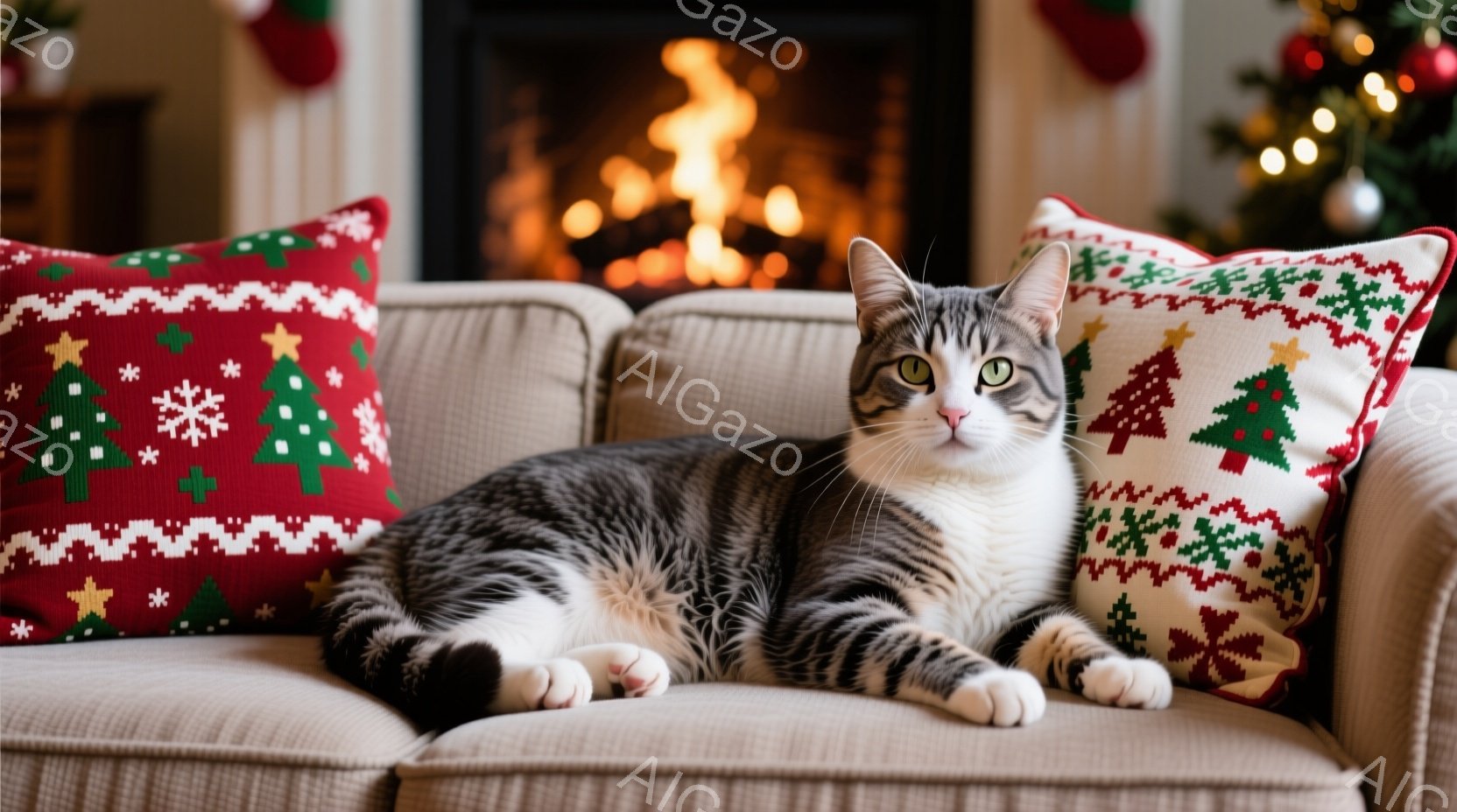 この無料AI生成画像「白と黒の縞模様の二匹の子猫が、金色のラメのガーランドに囲まれて横たわっています。子猫たちは好奇心とリラックスした表情でカメラを見つめており、ふわふわとした毛並みが可愛らしさを引き立てています。背景には、クリスマスツリーとプレゼントボックスが見え、暖かくお祝いムードに満ちた雰囲気です。」は、2025年10月25日に作成されました。 サイズは 1664×928px の高解像度で、商用利用も可能なフリー素材として提供しています。