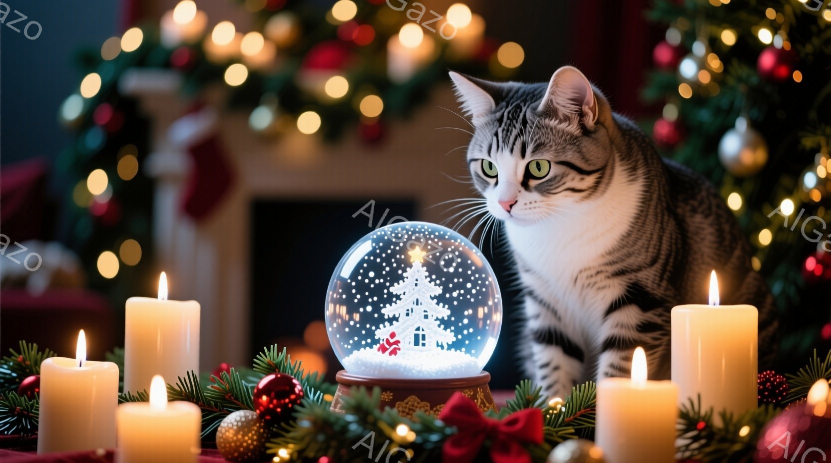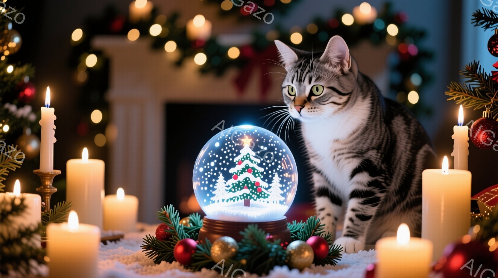 茶色の縞模様の猫が、クリスマスツリーが入ったスノーグローブの横に座り、興味深そうにスノーグローブを見つめている。背景には、緑色のガーランドと点滅するクリスマスライトがあり、暖かくお祝いの雰囲気を醸し出している。白いキャンドルがいくつか配置され、スノーグローブと猫を照らし、優しく幻想的な光を放っている。