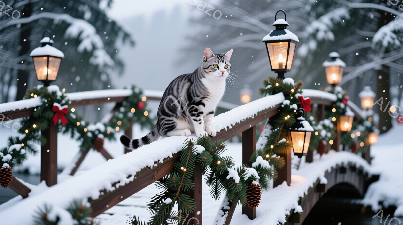 白とグレーの毛並みの猫が、雪で覆われた柵の上に座ってこちらを見ている。背景には、クリスマスツリーの飾り付けがされた柵が続き、雪が舞う冬の風景が広がっている。暖色のランタンの光が、雪景色に温かみを与え、静かで穏やかな雰囲気を醸し出している。