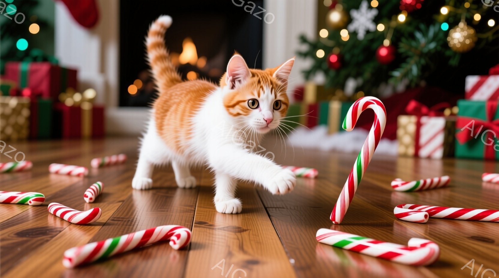 白とオレンジの毛並みを持つ子猫が、クリスマスのキャンディケーンが散らばる木の床の上を勢いよく駆け抜けている。背景には、オーナメントで飾られたクリスマスツリーと暖炉があり、温かく居心地の良い雰囲気を醸し出している。このシーンは、遊び心とクリスマスの喜びを表現している。