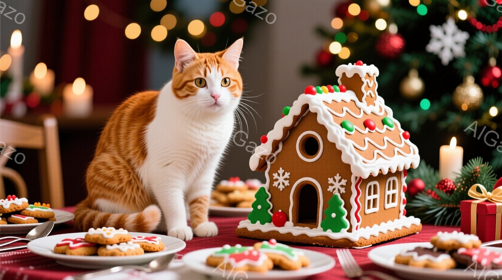 オレンジ色のトラ猫が赤いテーブルクロスの上に座り、正面をまっすぐ見ています。テーブルの上には、クリスマスツリーの形をしたジンジャーブレッドハウスや、可愛らしいクリスマス柄のクッキーが並べられており、背景にはぼやけたクリスマスツリーの光が輝いています。全体的に暖かく、お祝いムードに満ちた雰囲気です。