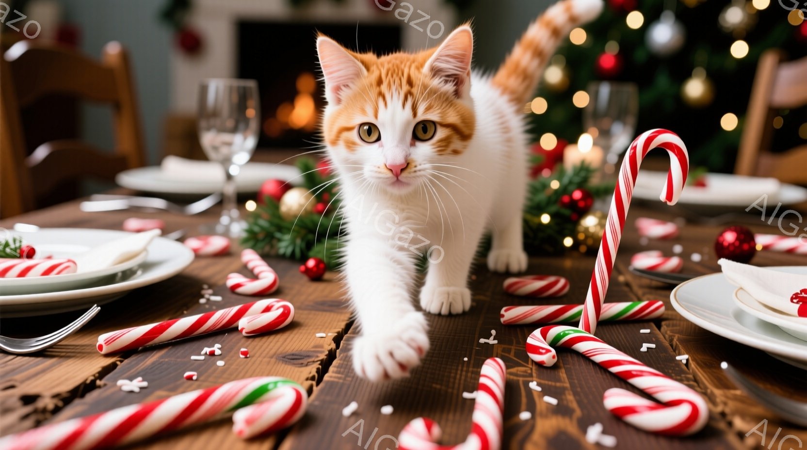 白とオレンジ色の縞模様の小さな子猫が、クリスマスを祝うテーブルの上を前足で歩いています。テーブルの上には、折れたキャンディケーンや装飾が散らばっており、背景にはぼやけたクリスマスツリーとキラキラ光るライトが見えます。暖かく、お祝いの雰囲気で、少しいたずらっぽい空気が漂っています。