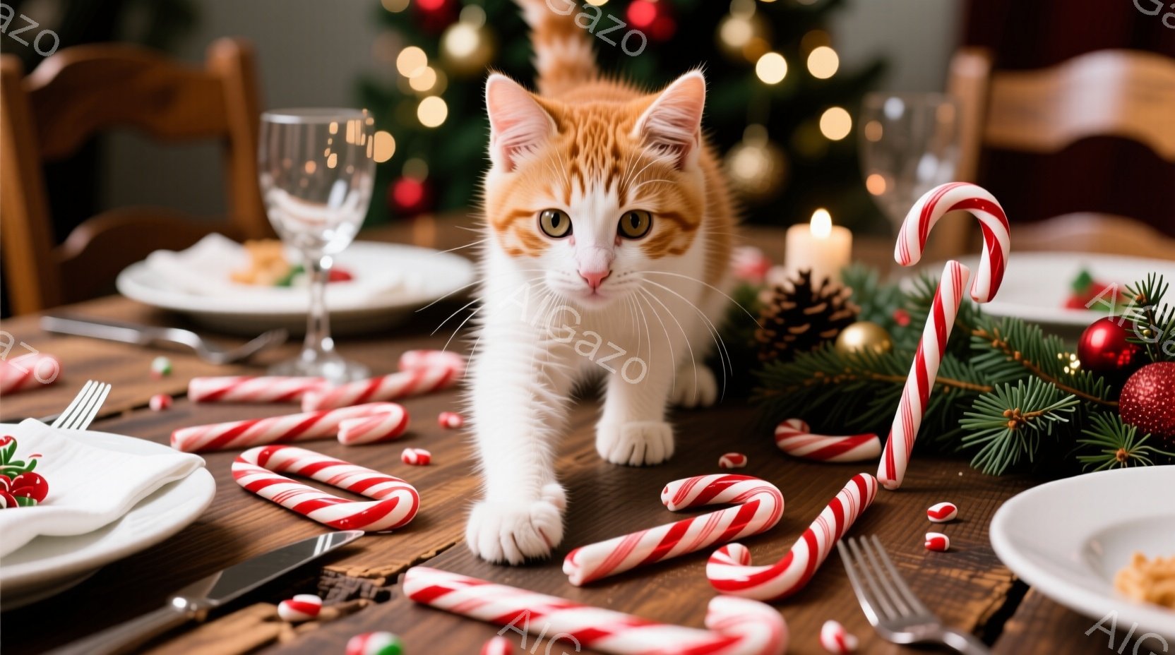 暖炉のある部屋で、クリスマスの飾り付けがされたテーブルの上を、茶白の猫が正面に向かって歩いている。テーブルの上には、キャンディケーンやキラキラした飾りなどが散らばり、猫は好奇心旺盛な表情でこちらを見ている。全体的に暖かく、遊び心のあるクリスマスの雰囲気が漂っている。